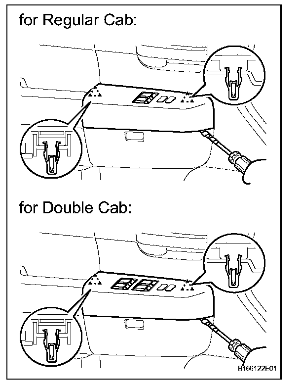 a. Using a screwdriver, detach the 2 clips and remove the front upper armrest base panel LH.