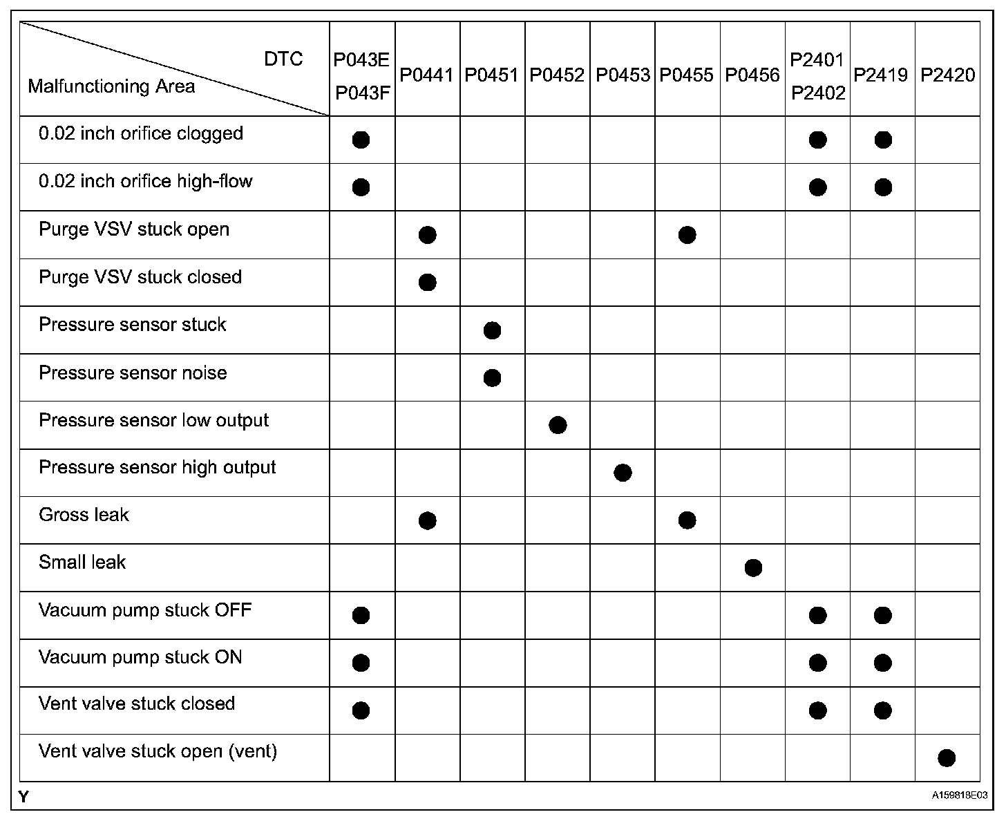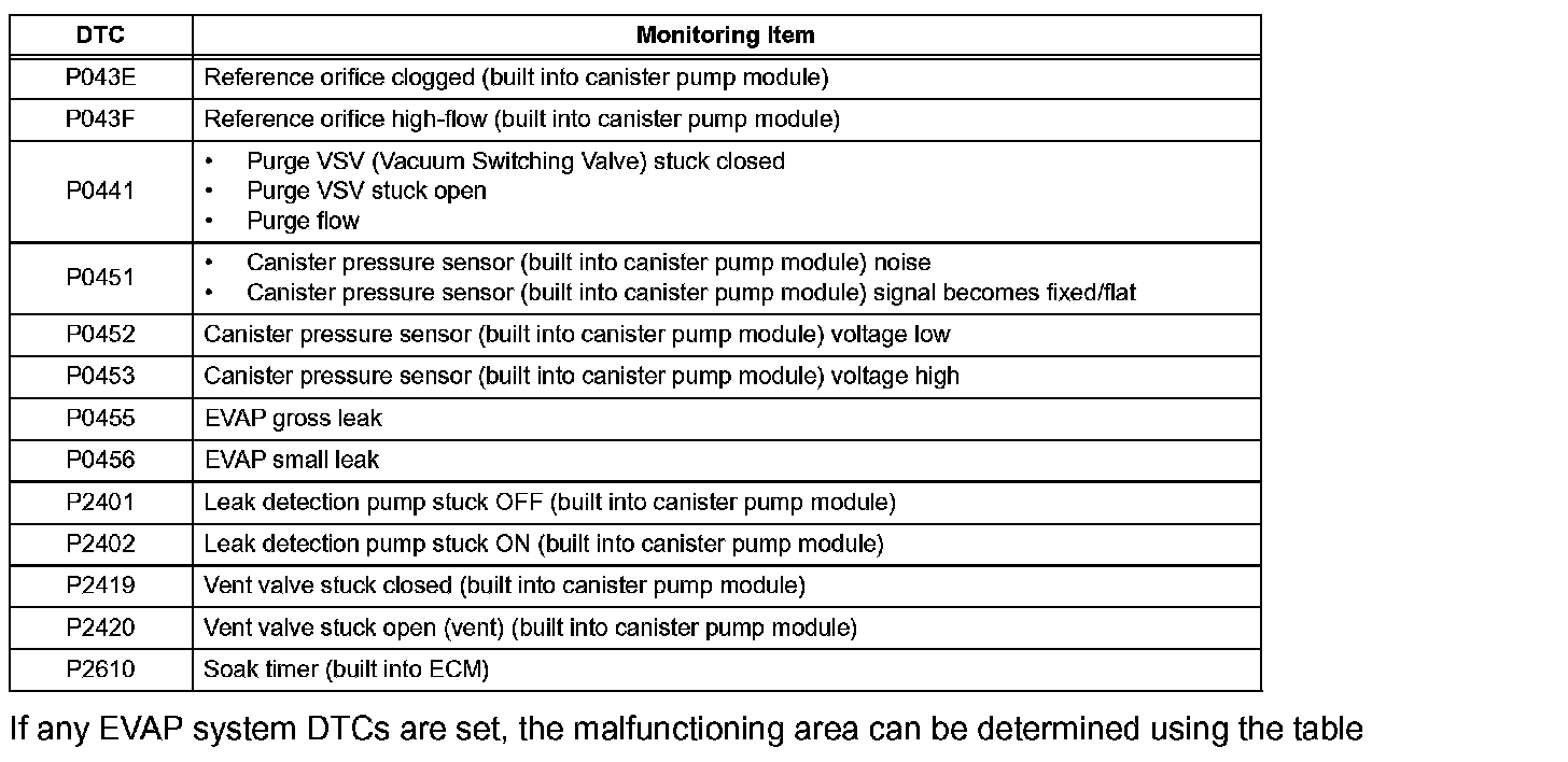 If any EVAP system DTCs are set, the malfunctioning area can be determined using the table.