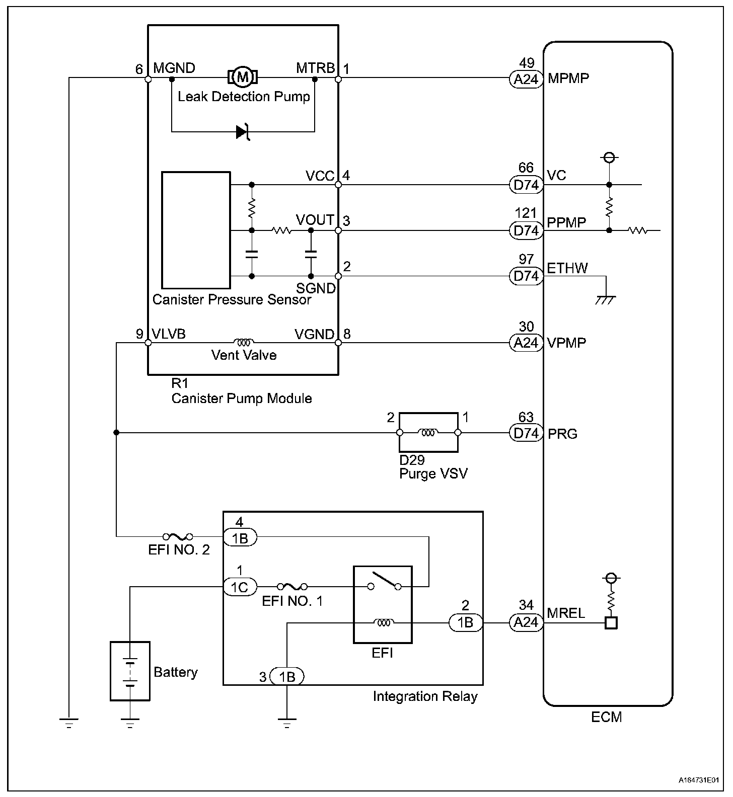 The leak detection pump creates negative pressure (vacuum) in the EVAP system and the pressure is measured. Finally, the ECM monitors for leaks from the EVAP system, and malfunctions in both the canister pump module and purge VSV, based on the EVAP pressure.