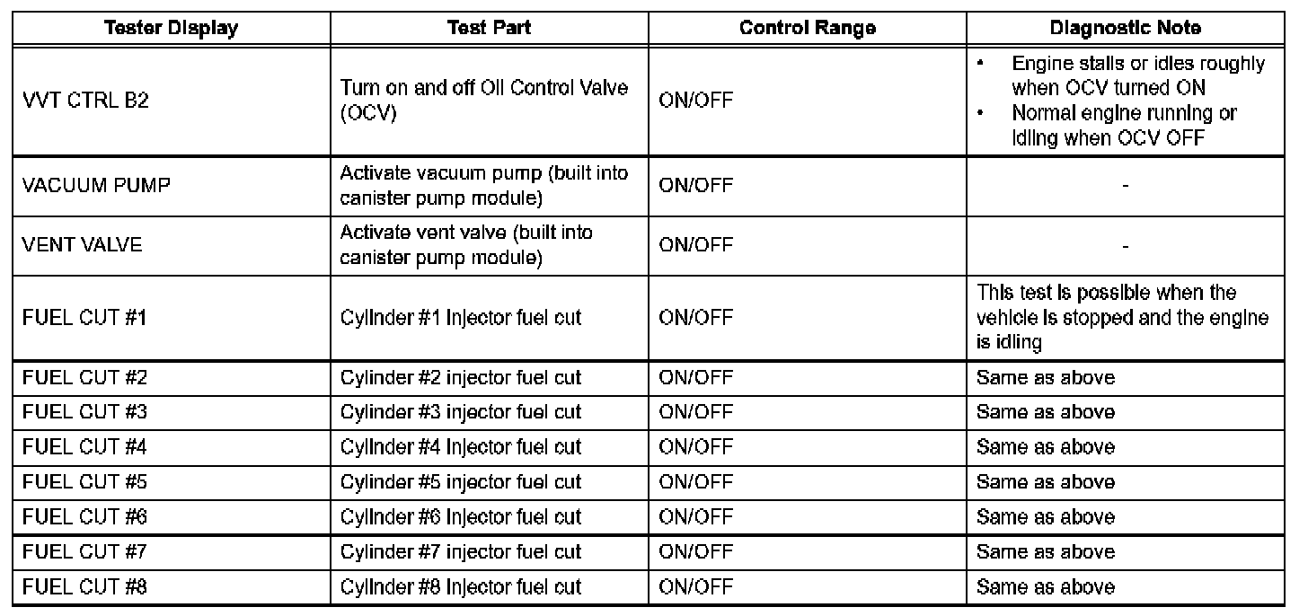 ACTIVE TESTHINT: Using the intelligent tester or Techstream to perform Active Tests allows relays, VSVs, actuators and other items to be operated without removing any parts. This non-intrusive functional inspection can be very useful because intermittent operation may be discovered before parts or wiring is disturbed. Performing Active Tests early in troubleshooting is one way to save diagnostic time. Data List information can be displayed while performing Active Tests.