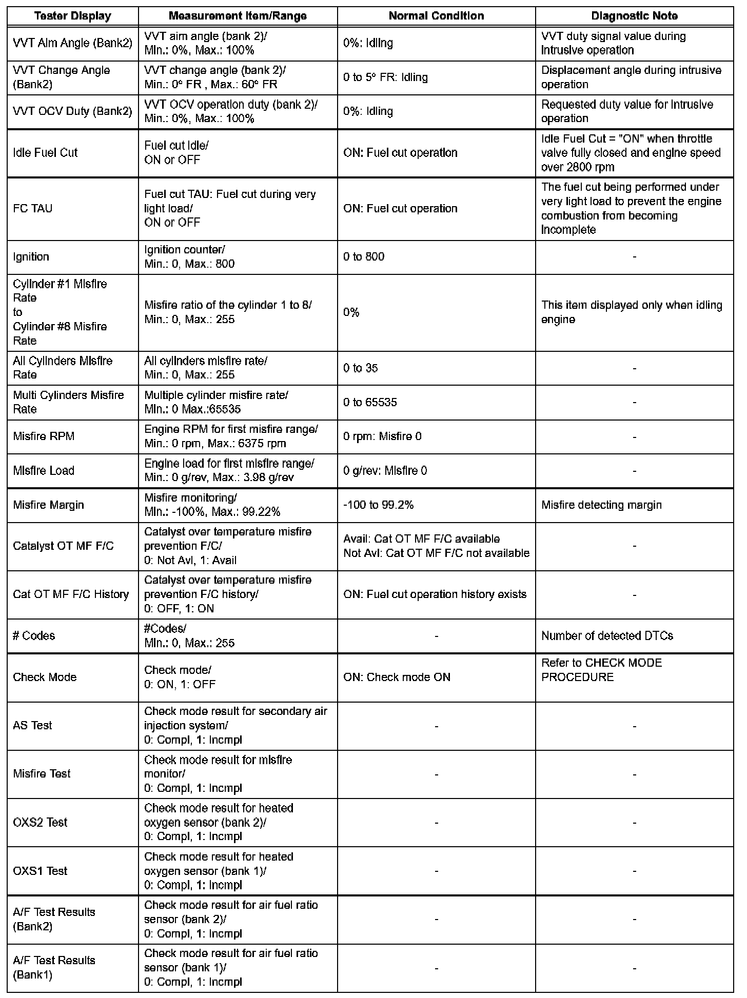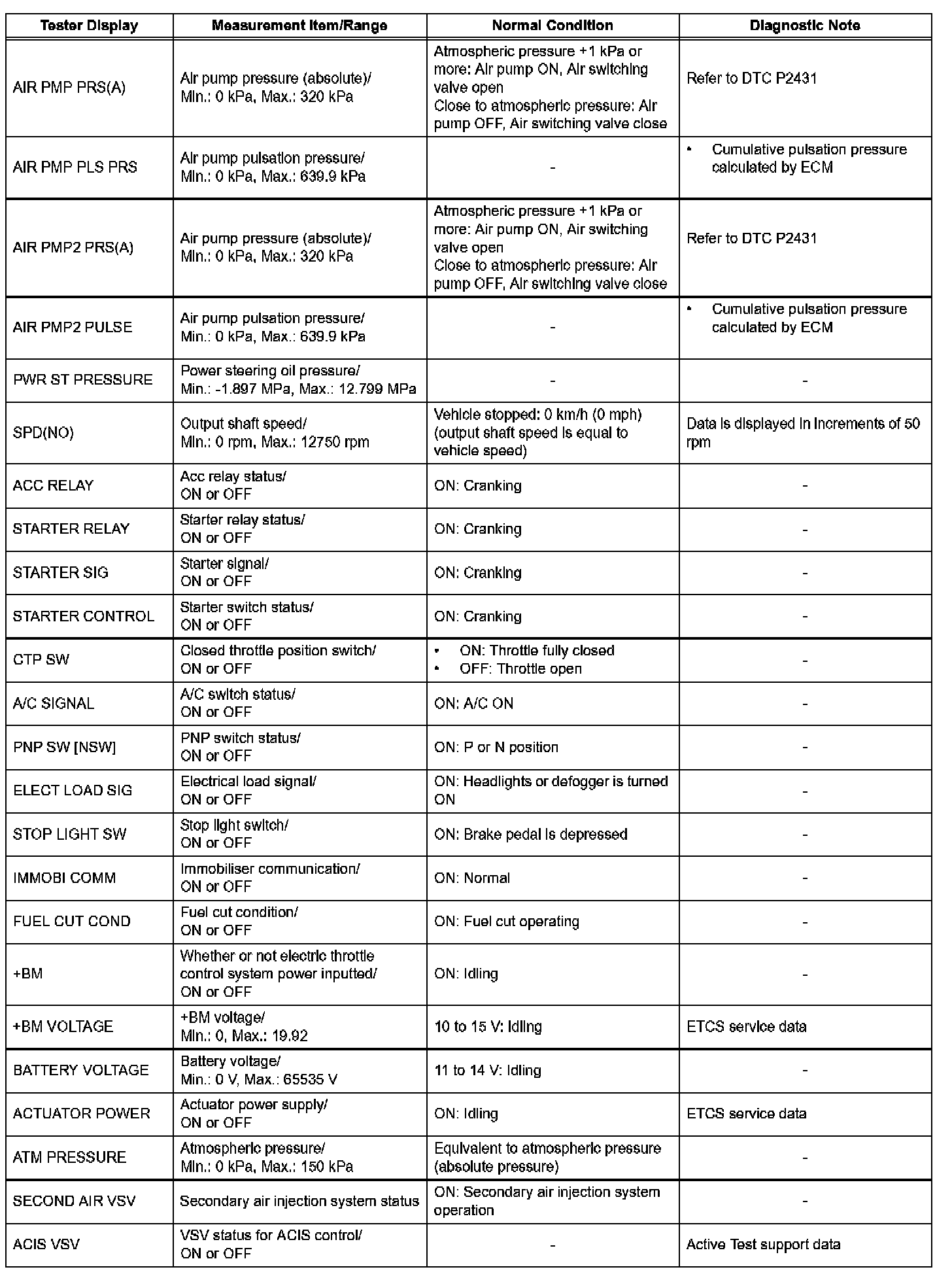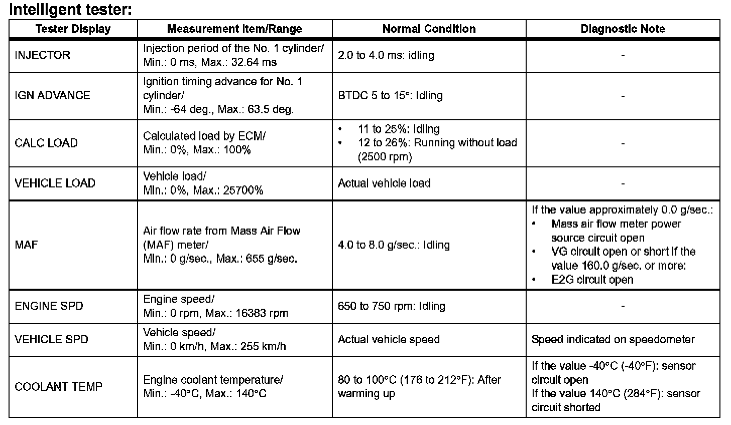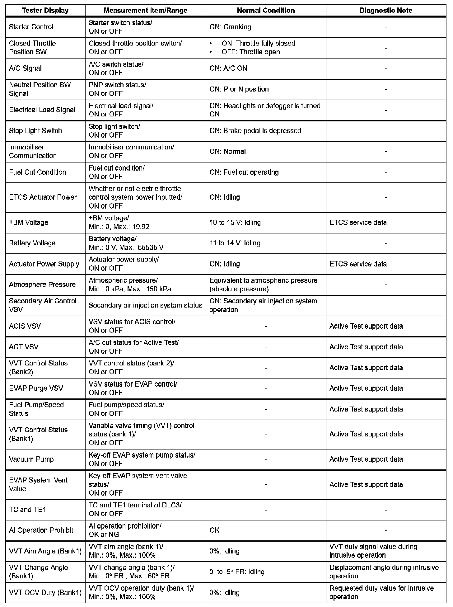 DATA LISTHINT: Using the intelligent tester or Techstream to read the Data List allows the values or states of switches, sensors, actuators and other items to be read without removing any parts. This non-intrusive inspection can be very useful because intermittent conditions or signals may be discovered before parts or wiring is disturbed. Reading the Data List information early in troubleshooting is one way to save diagnostic time.
