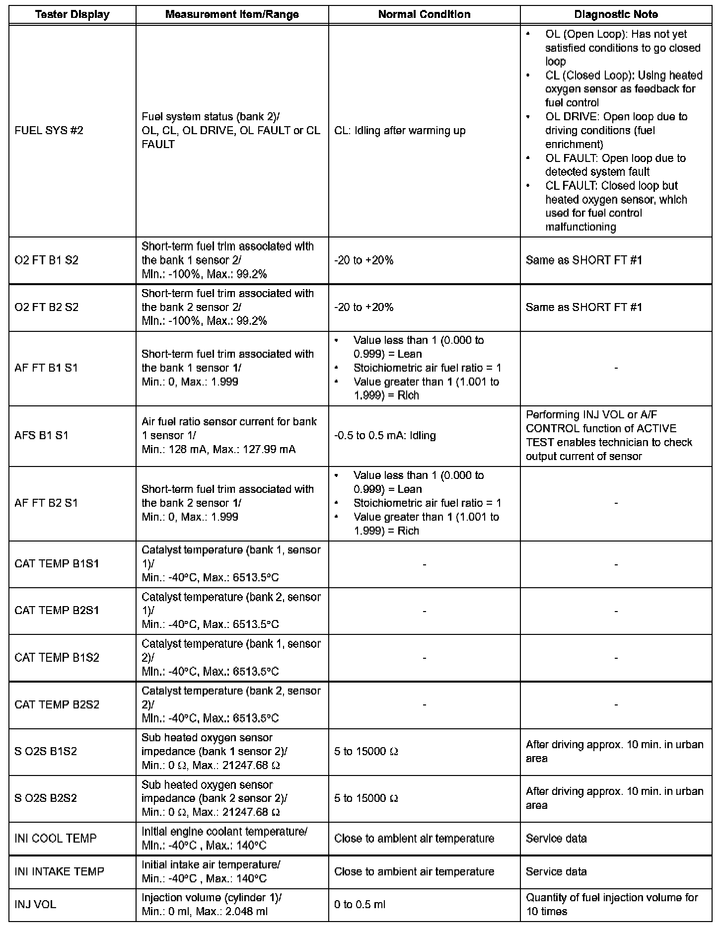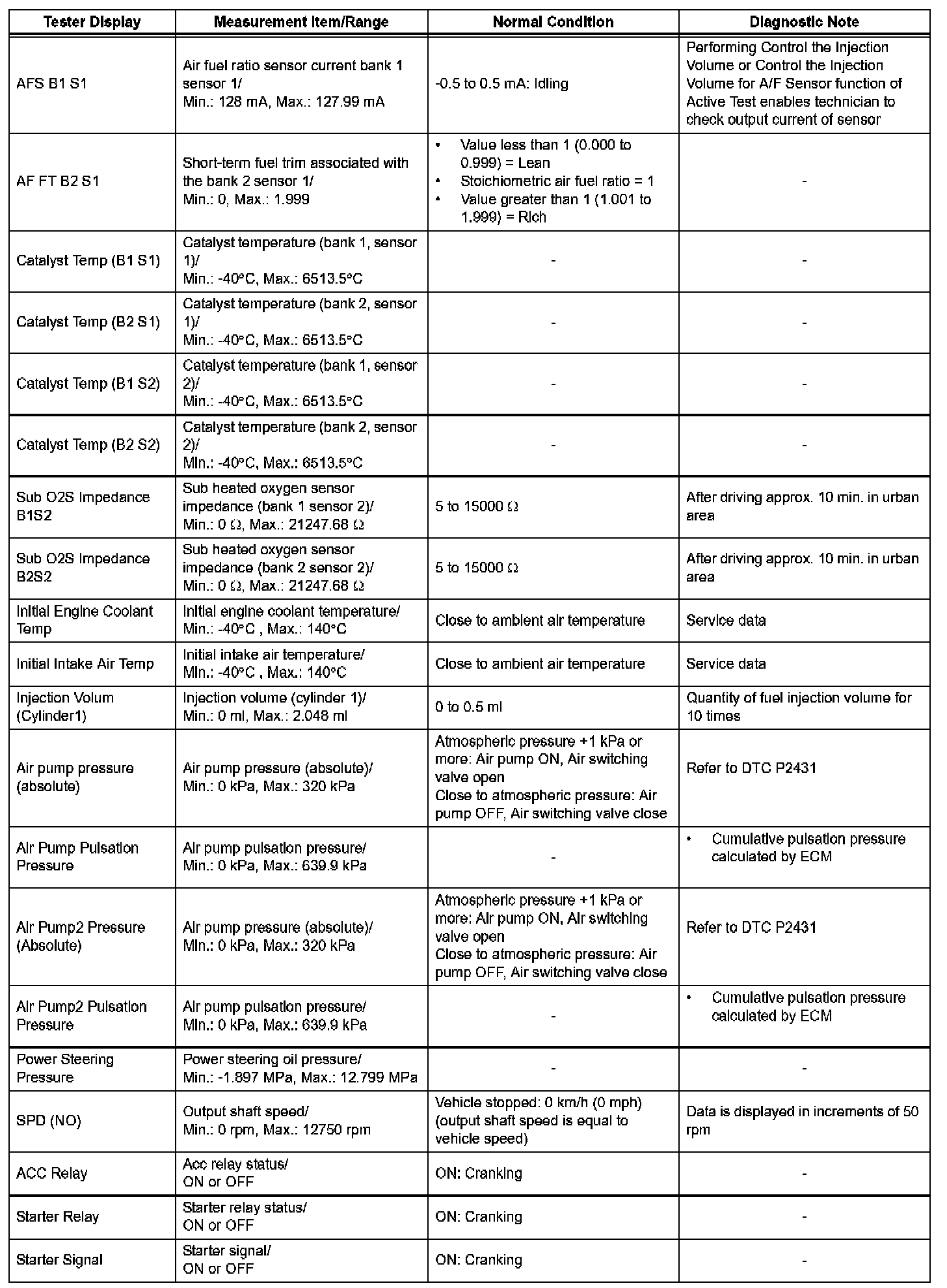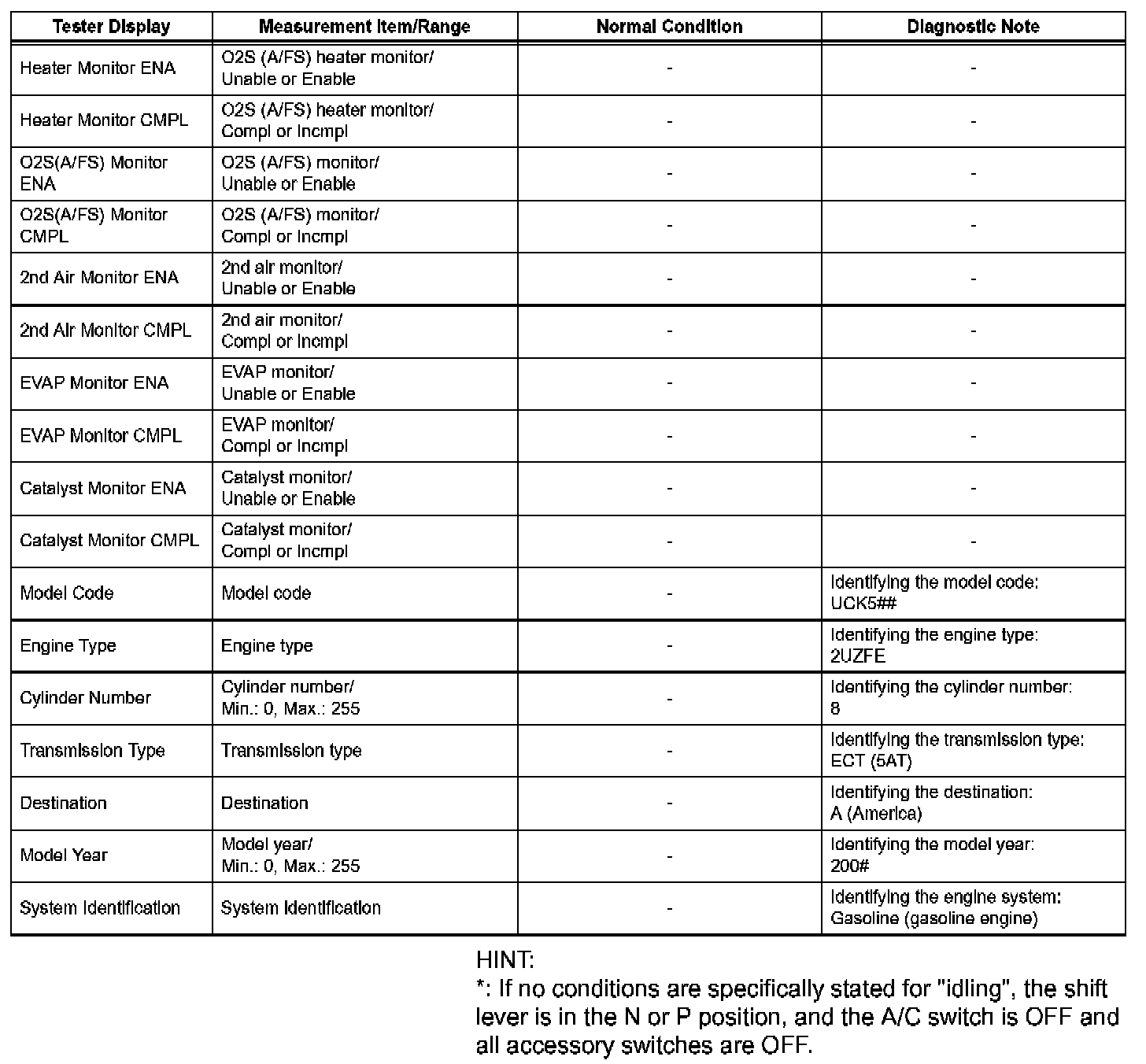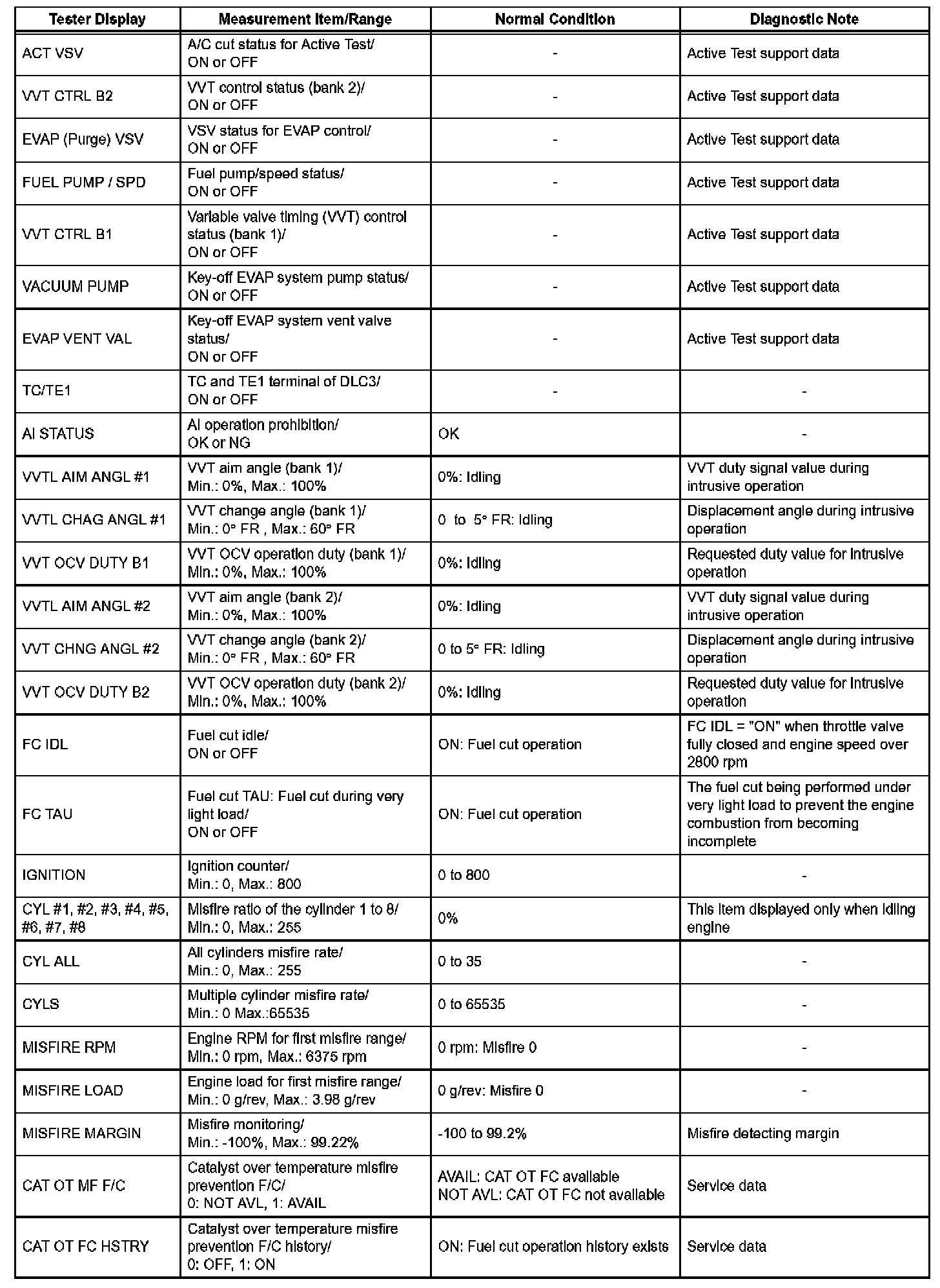 DATA LISTHINT: Using the intelligent tester or Techstream to read the Data List allows the values or states of switches, sensors, actuators and other items to be read without removing any parts. This non-intrusive inspection can be very useful because intermittent conditions or signals may be discovered before parts or wiring is disturbed. Reading the Data List information early in troubleshooting is one way to save diagnostic time.