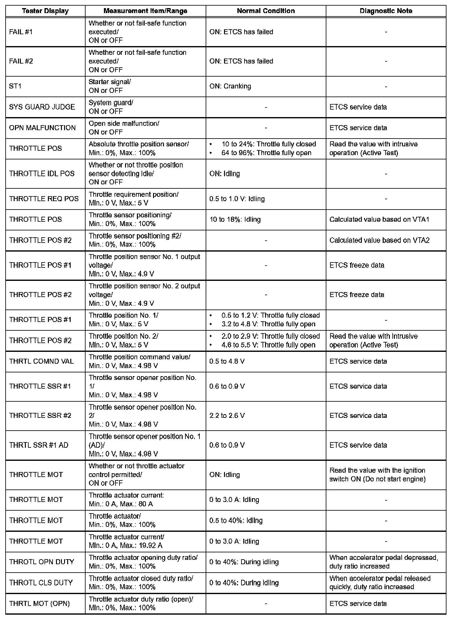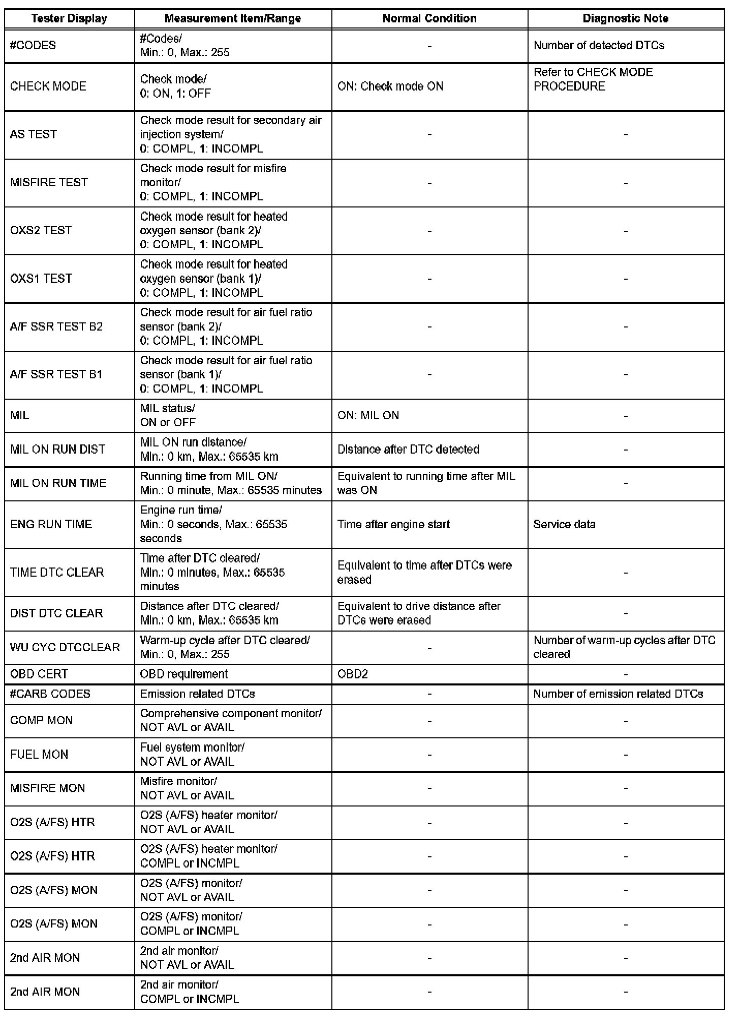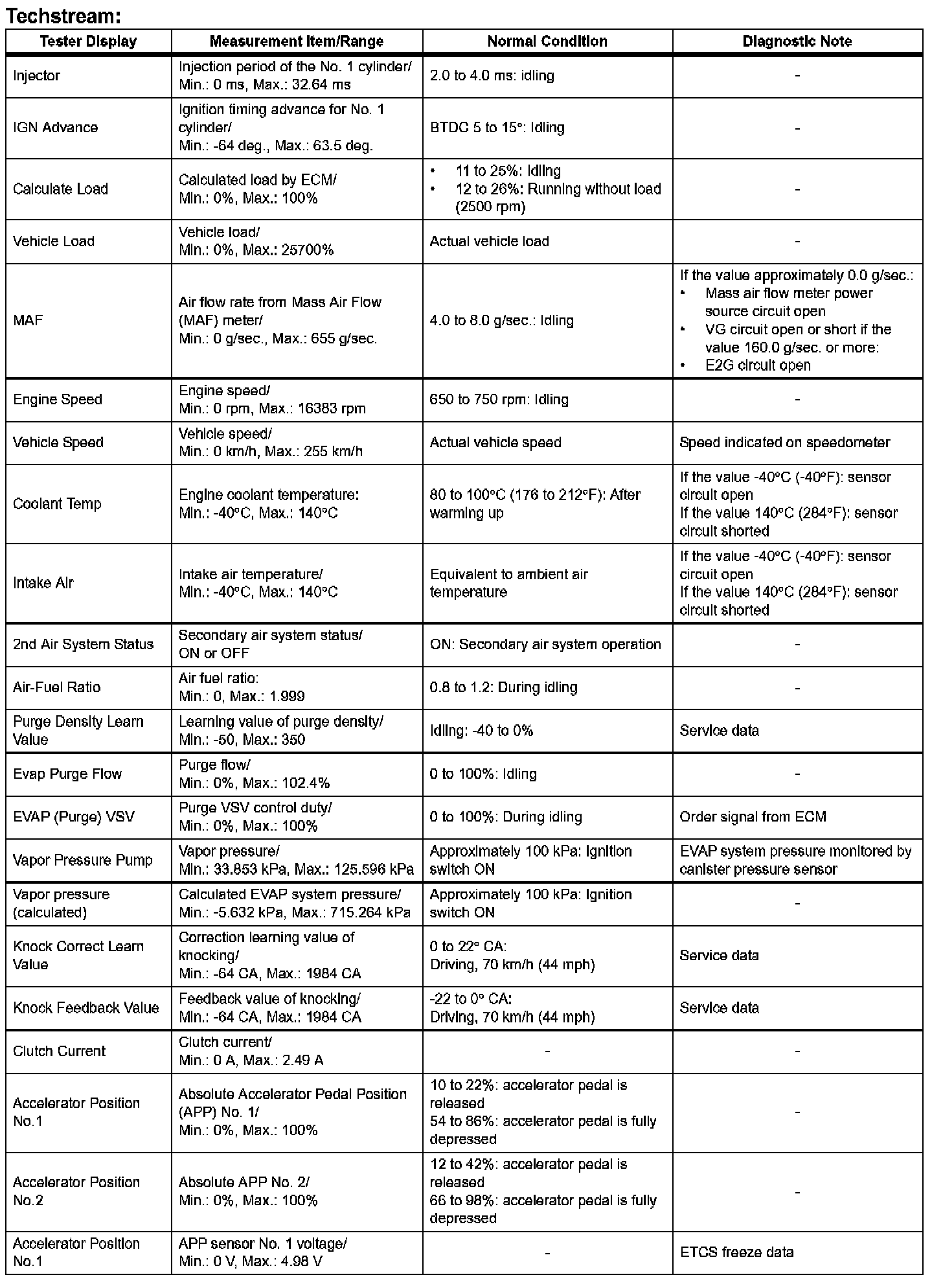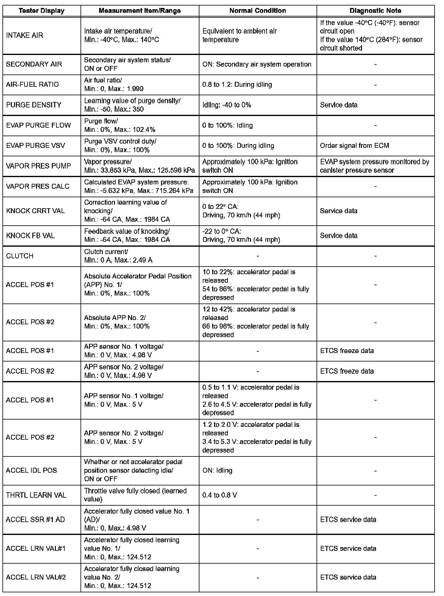 DATA LISTHINT: Using the intelligent tester or Techstream to read the Data List allows the values or states of switches, sensors, actuators and other items to be read without removing any parts. This non-intrusive inspection can be very useful because intermittent conditions or signals may be discovered before parts or wiring is disturbed. Reading the Data List information early in troubleshooting is one way to save diagnostic time.
