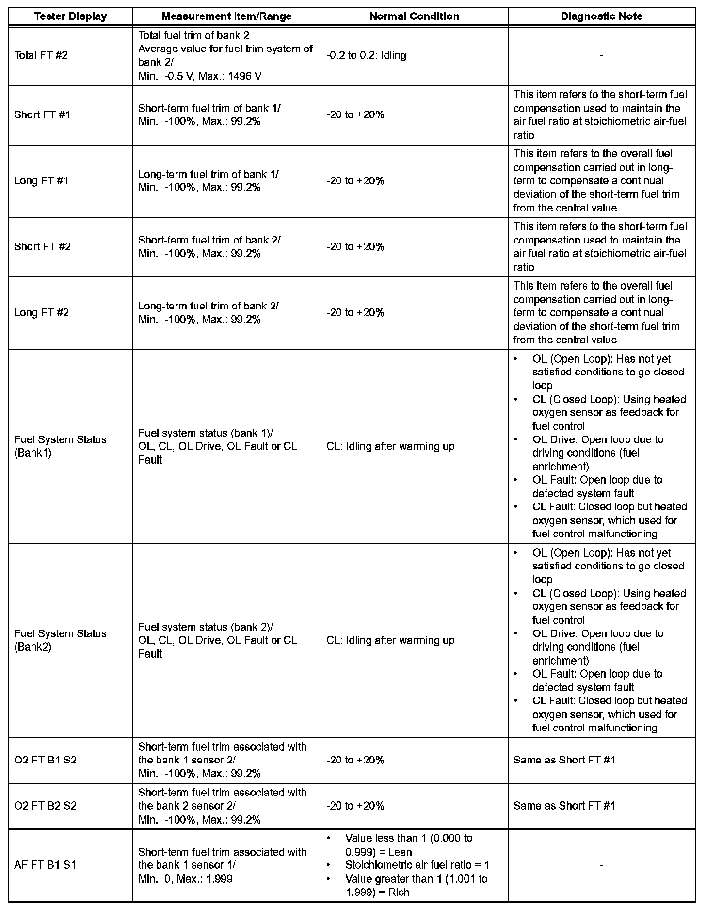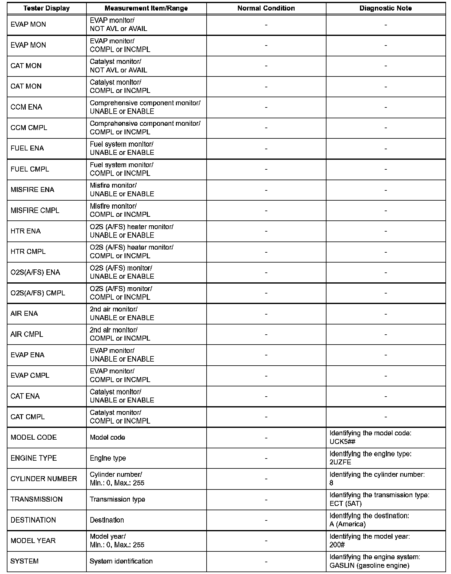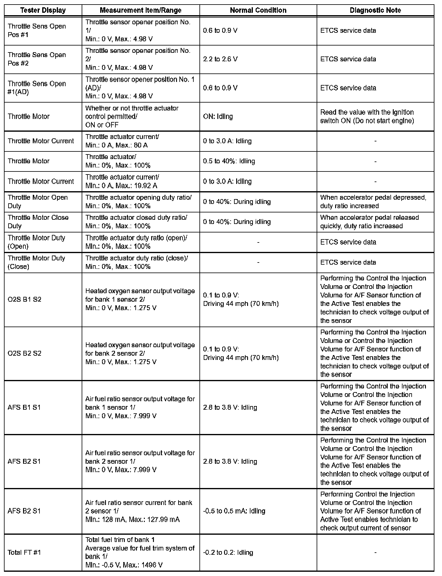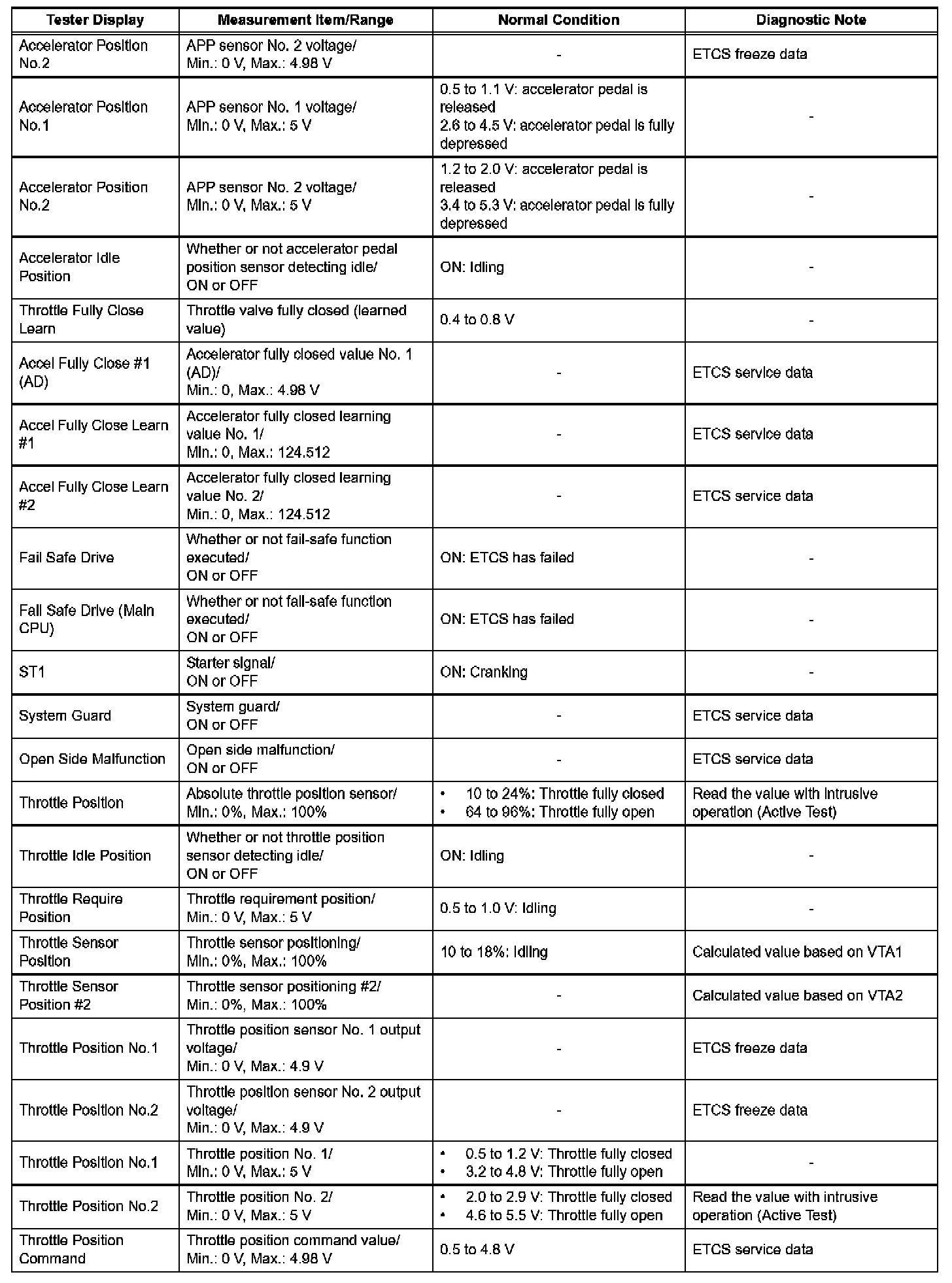 DATA LISTHINT: Using the intelligent tester or Techstream to read the Data List allows the values or states of switches, sensors, actuators and other items to be read without removing any parts. This non-intrusive inspection can be very useful because intermittent conditions or signals may be discovered before parts or wiring is disturbed. Reading the Data List information early in troubleshooting is one way to save diagnostic time.