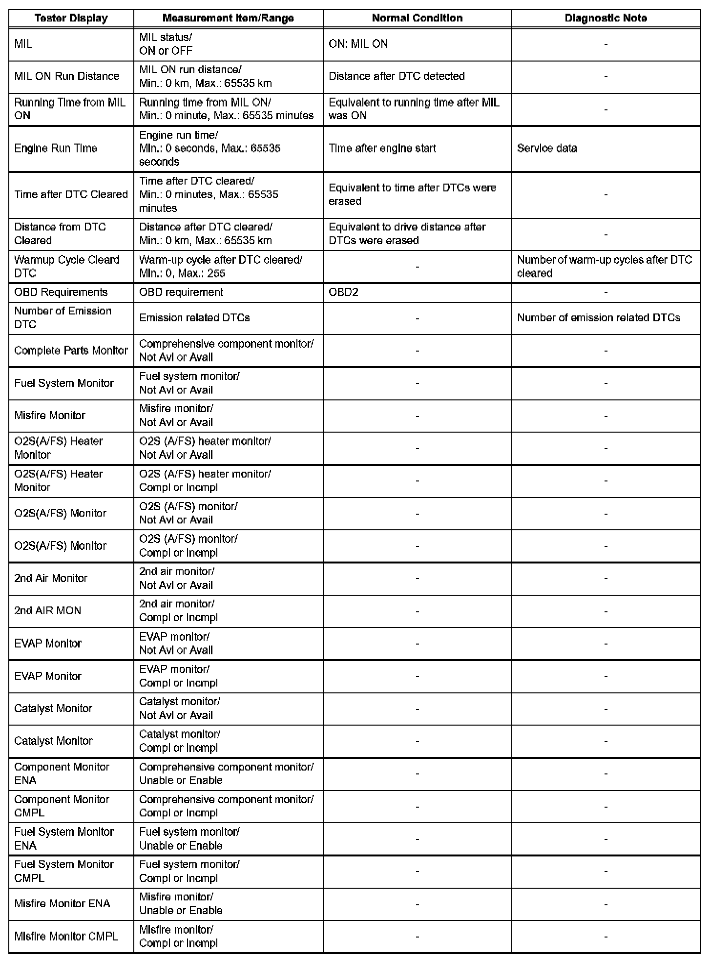 NOTE: In the table, the values listed under "Normal Condition" are reference values. Do not depend solely on these reference values when deciding whether a part is faulty or not.
