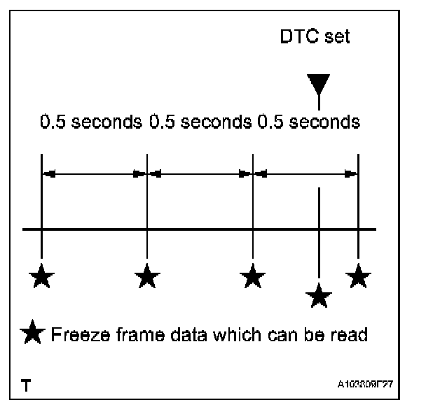 HINT: If it is impossible to duplicate the problem even though a DTC is detected, confirm the freeze frame data. The ECM records engine conditions in the form of freeze frame data every 0.5 seconds. Using the intelligent tester or Techstream, 5 separate sets of freeze frame data can be checked.