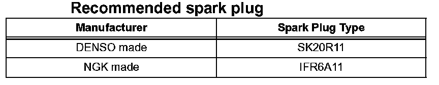 Electrode gap for a new spark plug: 1.0 to 1.1 mm (0.0394 to 0.0433 in.)
