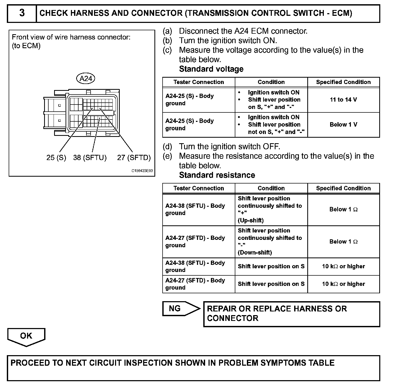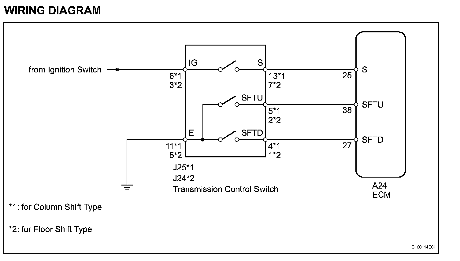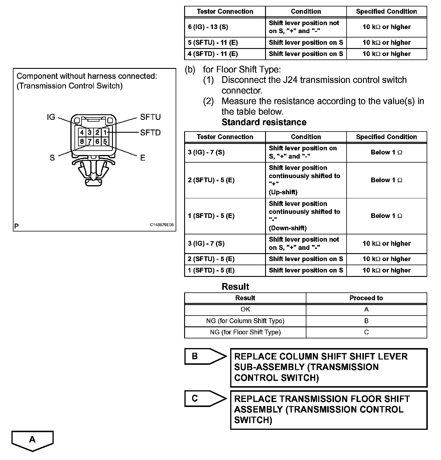 When moving the shift lever into the S position using the transmission control switch, it is possible to switch the shift range position between "1" (1st range) and "5" (5th range). Shifting to "+" once raises the shift range position by one, and shifting to "-" lowers the shift range position by one.