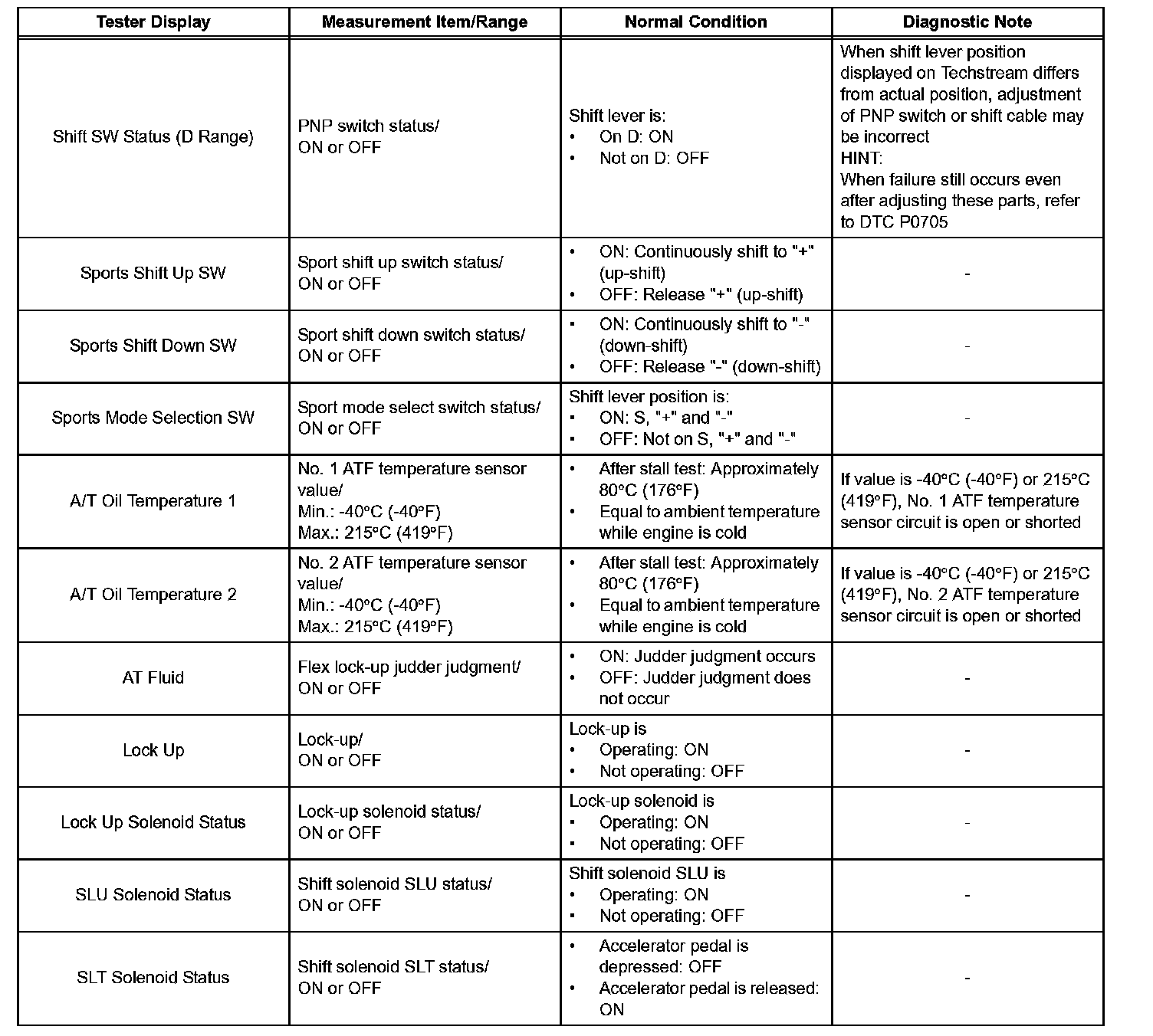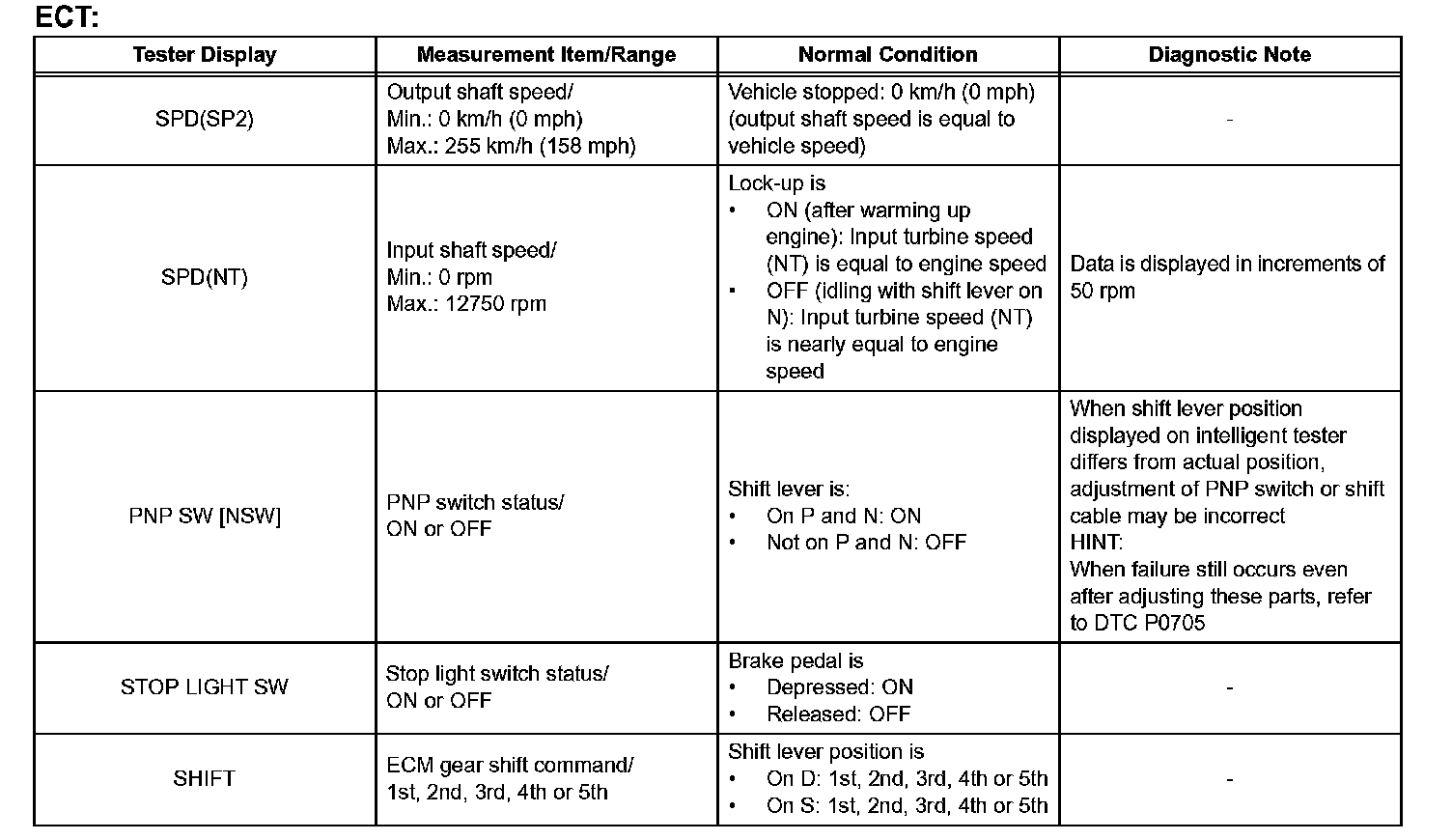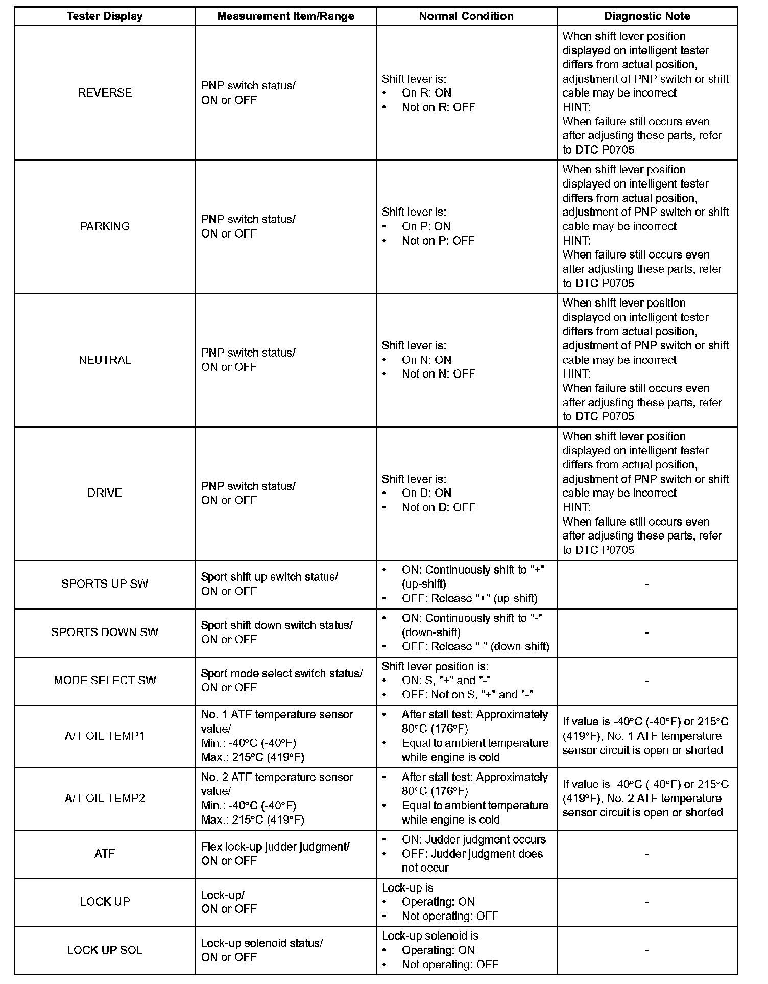 HINT: Using the intelligent tester or Techstream to read the Data List allows the values or states of switches, sensors, actuators and other items to be read without removing any parts. This non-intrusive inspection can be very useful because intermittent conditions or signals may be discovered before parts or wiring is disturbed. Reading the Data List information early in troubleshooting is one way to save diagnostic time.