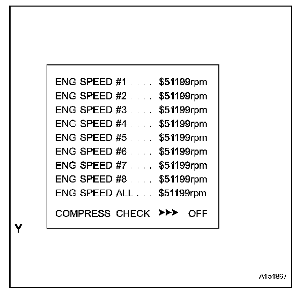 In this ACTIVE TEST, the fuel and ignition of all cylinders are cut, and cranking occurs for approximately 10 seconds. Then, each cylinder measures the engine rpm. If a cylinder's engine rpm is higher than the other, that cylinder's compression pressure is compared to the other, and is determined whether it is low or not.