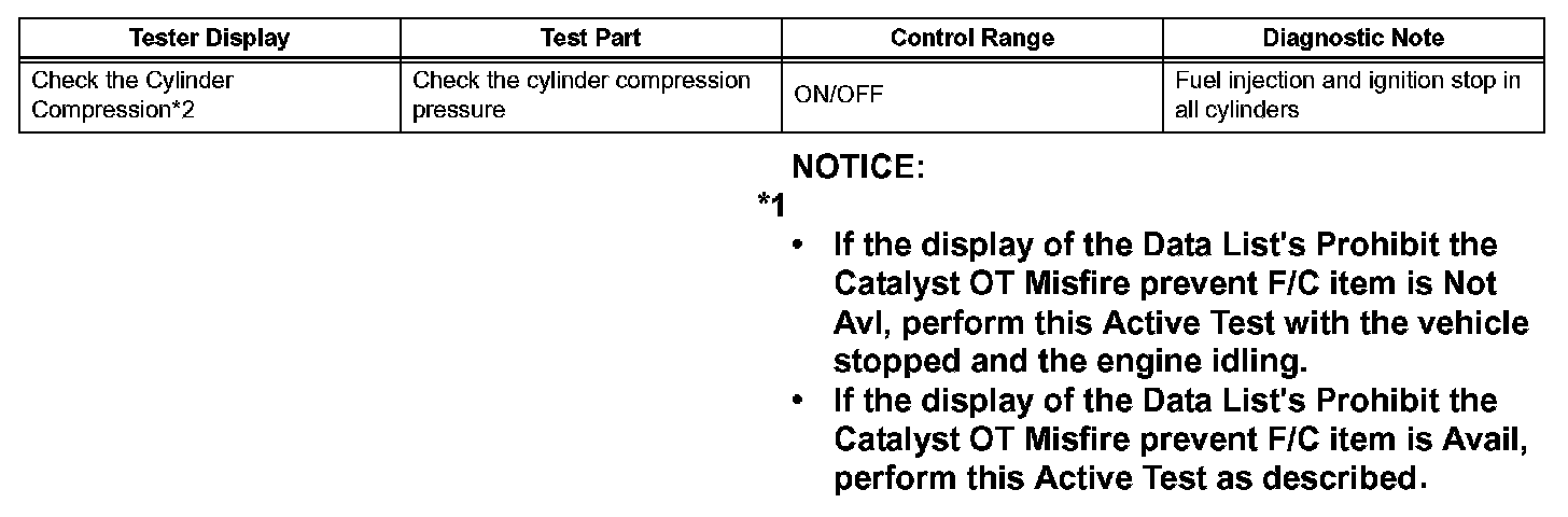 HINT: *2: When cranking the engine, each cylinder measures the engine rpm. In this Active Test, the fuel and ignition of all cylinders is cut, and cranking occurs for approximately 10 seconds. Then, each cylinder measures the engine rpm. If a cylinder's engine rpm is higher than the other, that cylinder's compression pressure is compared to the other, and whether or not the compression pressure is low can be determined.