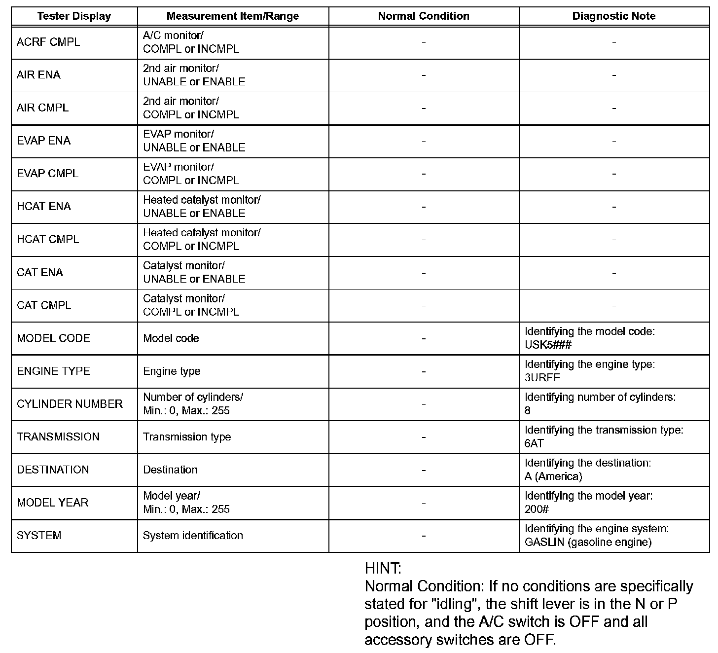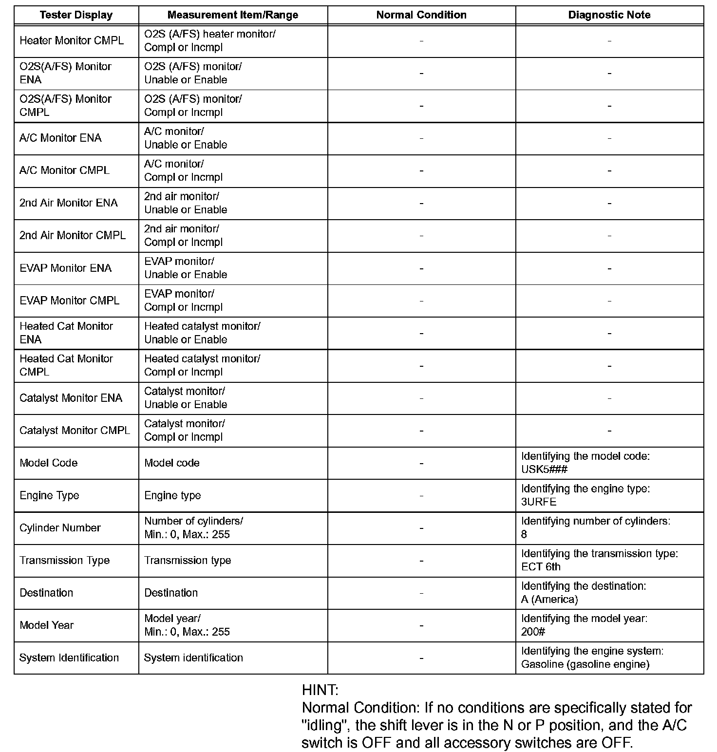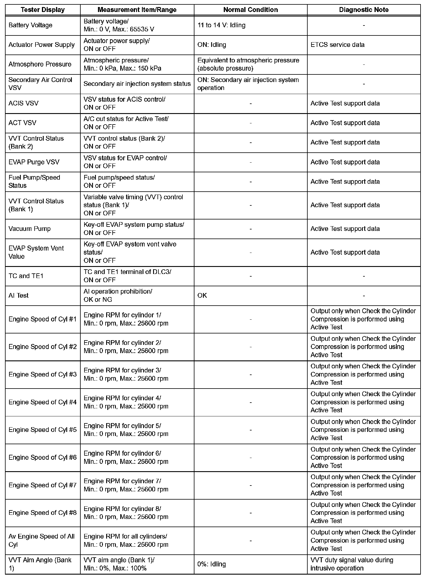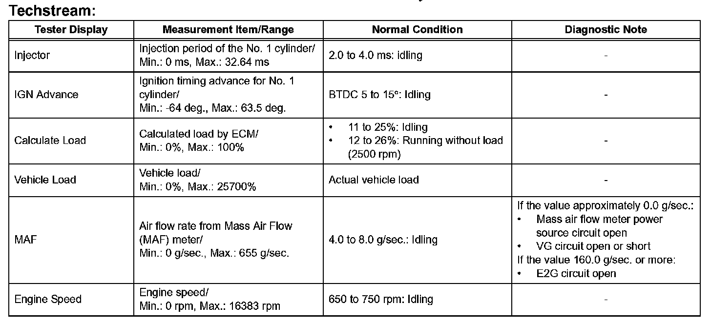 DATA LISTHINT: Using the intelligent tester or Techstream to read the Data List allows the values or states of switches, sensors, actuators and other items to be read without removing any parts. This non-intrusive inspection can be very useful because intermittent conditions or signals may be discovered before parts or wiring is disturbed. Reading the Data List information early in troubleshooting is one way to save diagnostic time.