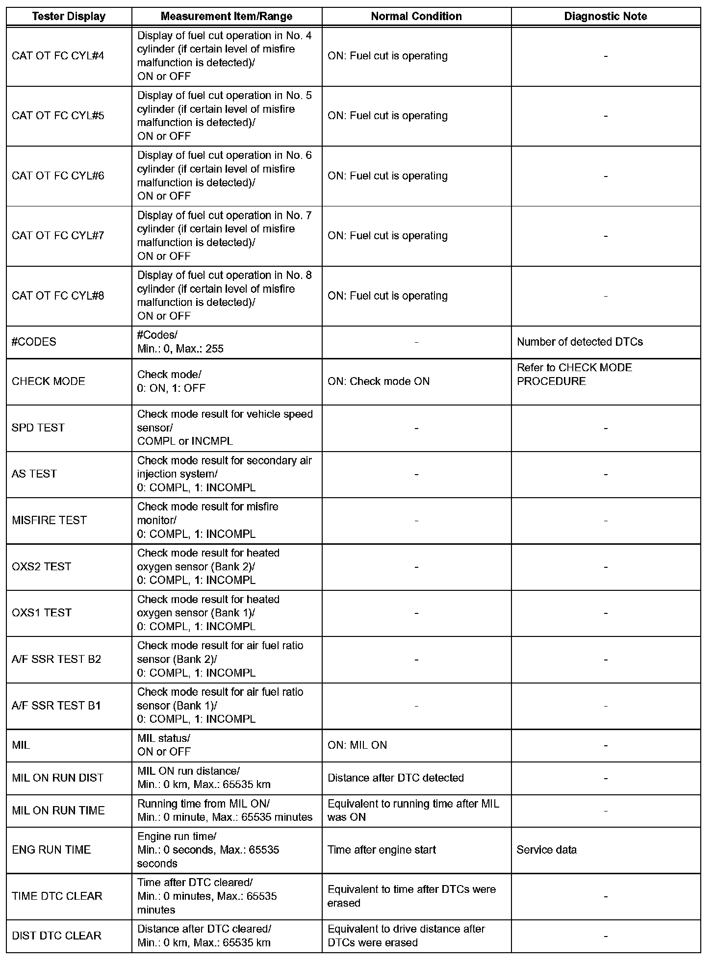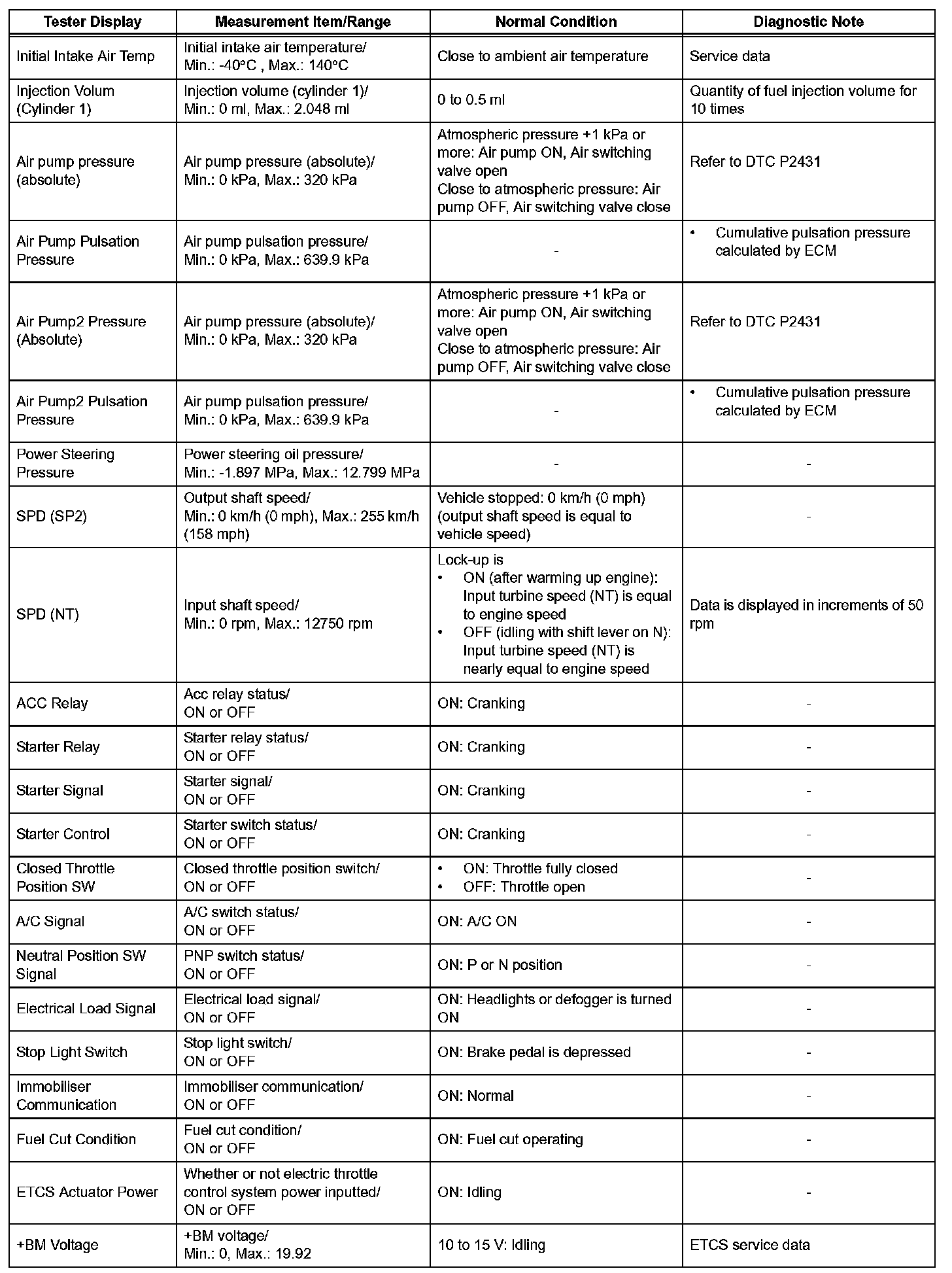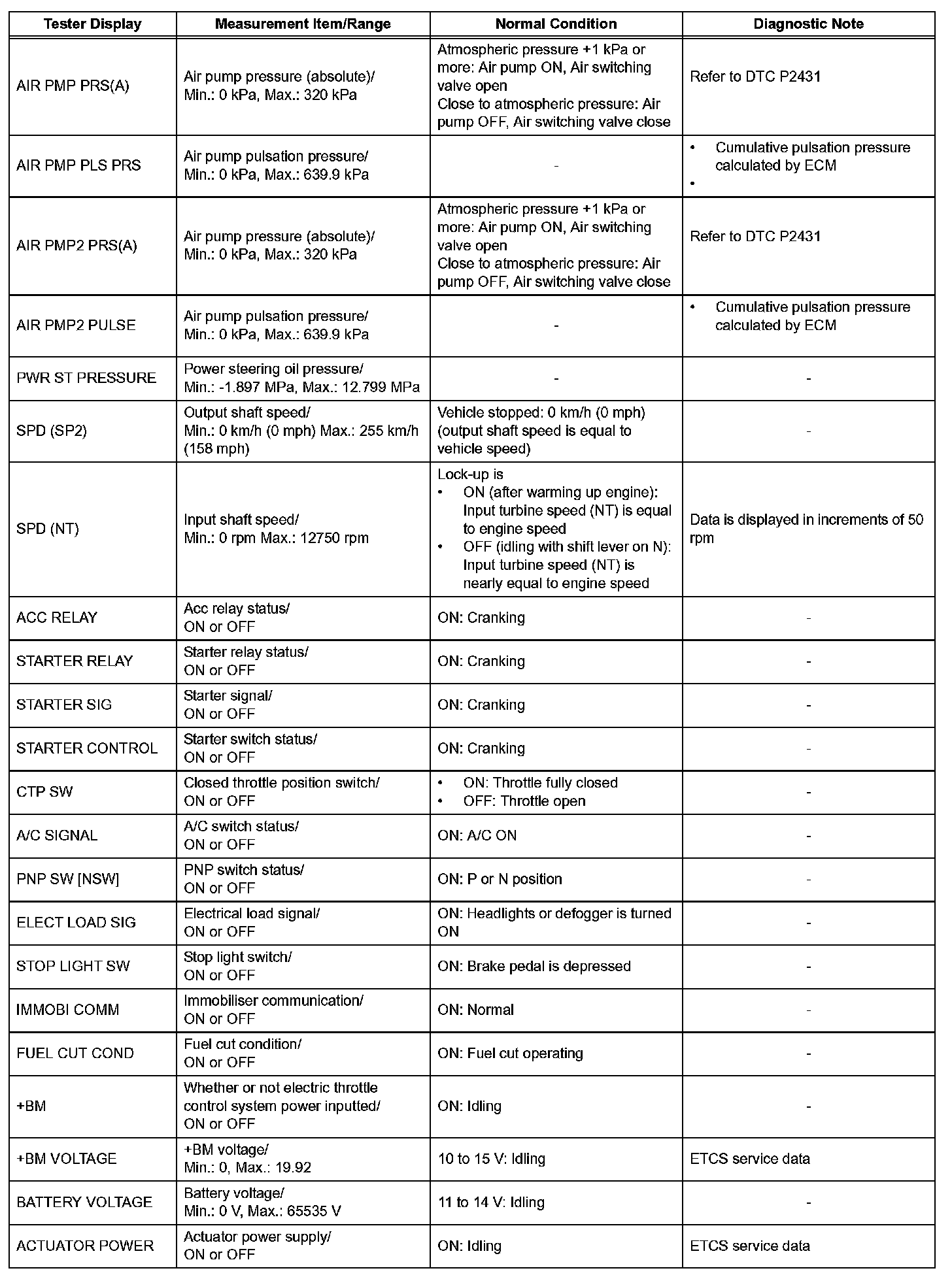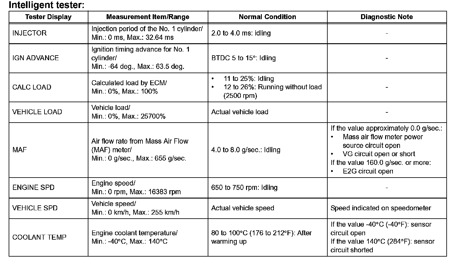 DATA LISTHINT: Using the intelligent tester or Techstream to read the Data List allows the values or states of switches, sensors, actuators and other items to be read without removing any parts. This non-intrusive inspection can be very useful because intermittent conditions or signals may be discovered before parts or wiring is disturbed. Reading the Data List information early in troubleshooting is one way to save diagnostic time.