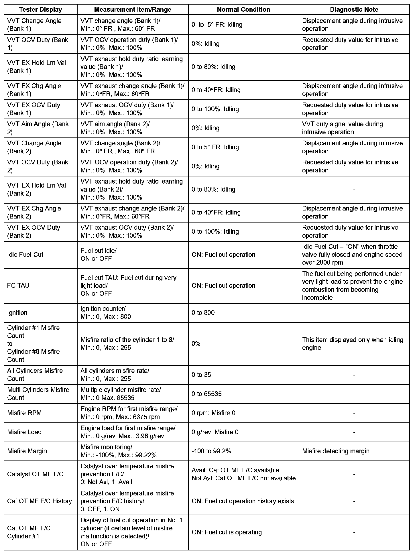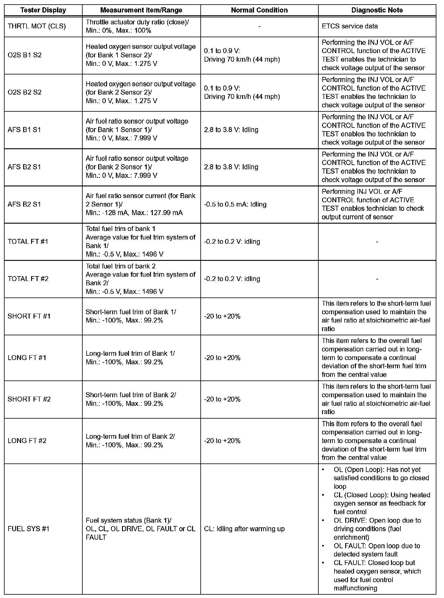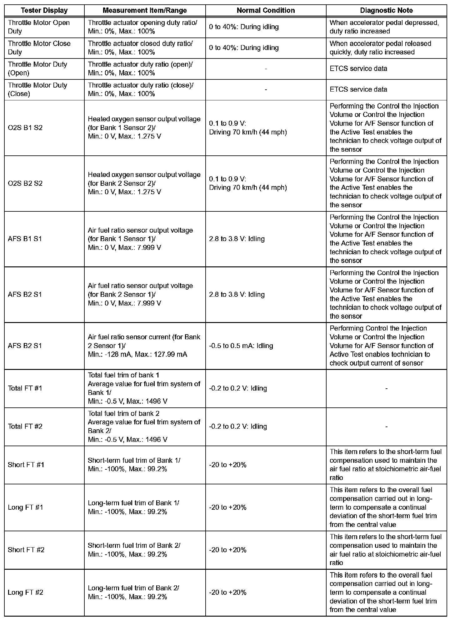 NOTE: In the table, the values listed under "Normal Condition" are reference values. Do not depend solely on these reference values when deciding whether a part is faulty or not.