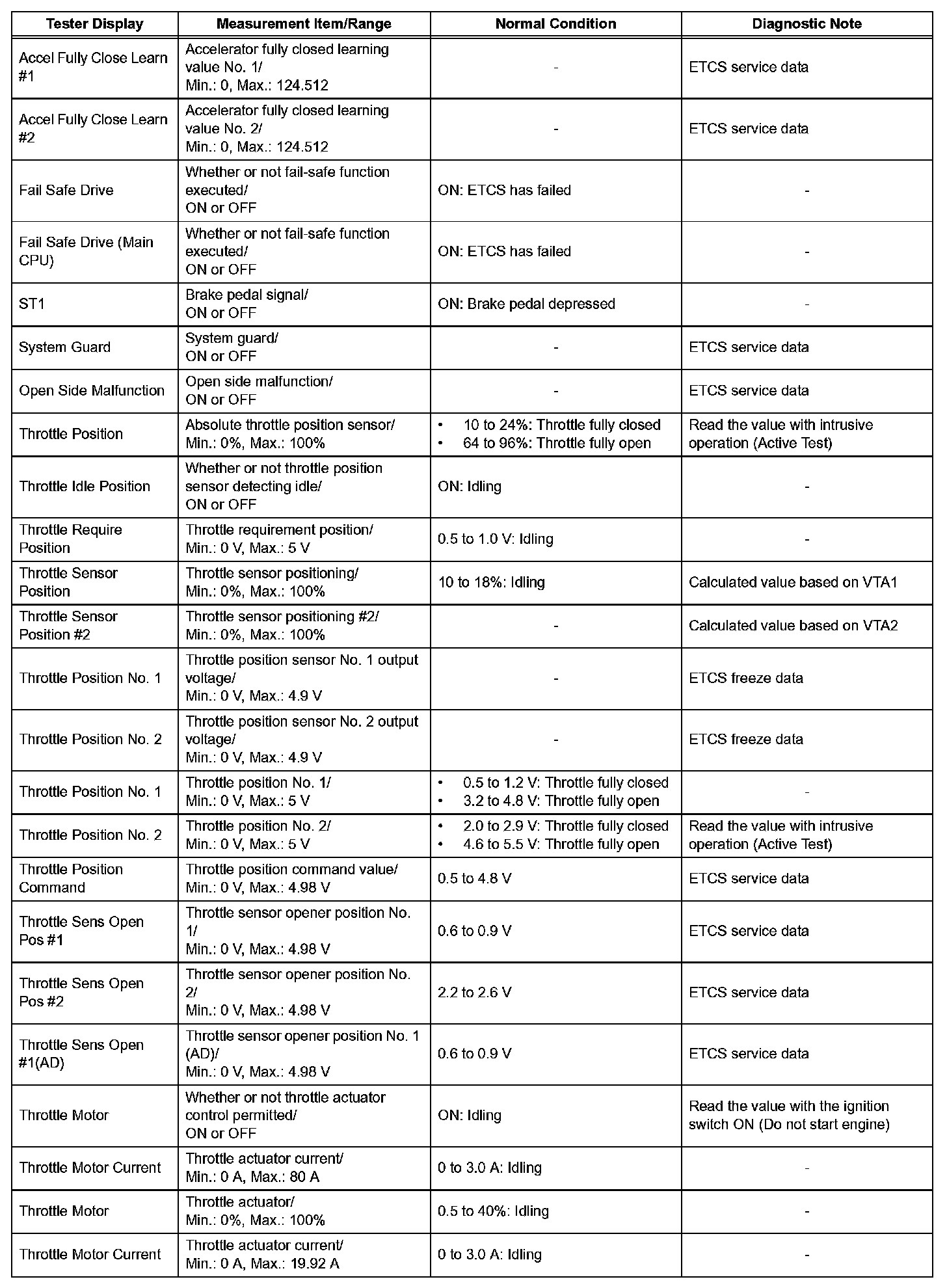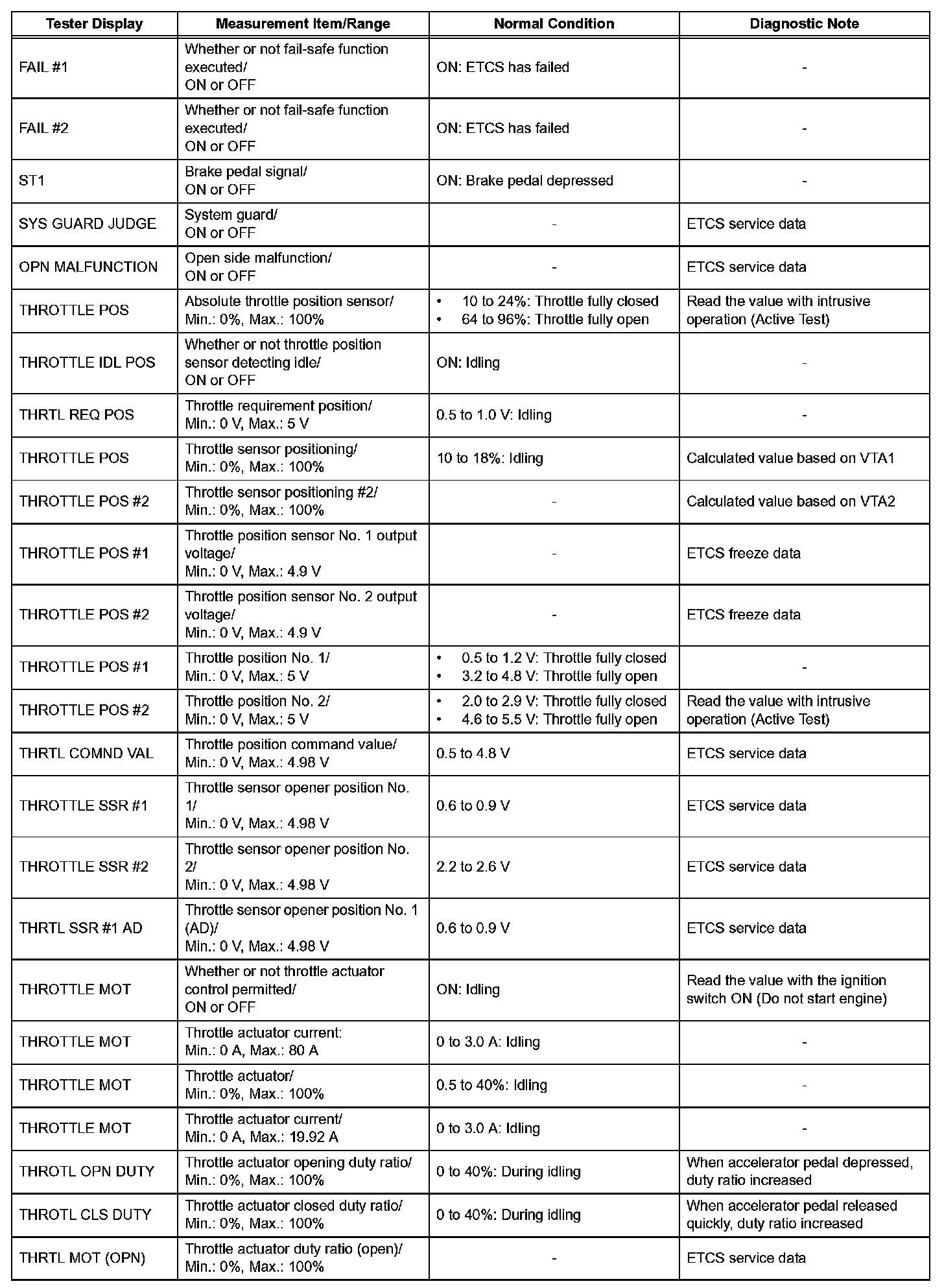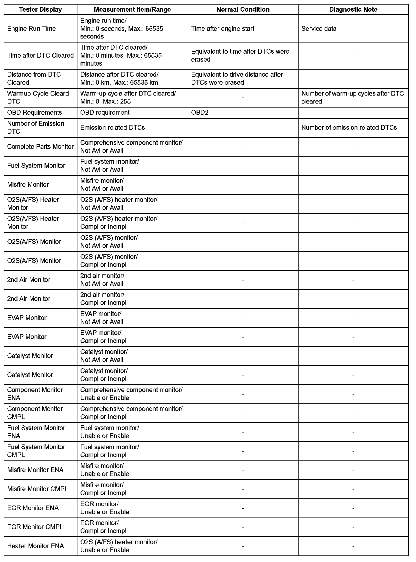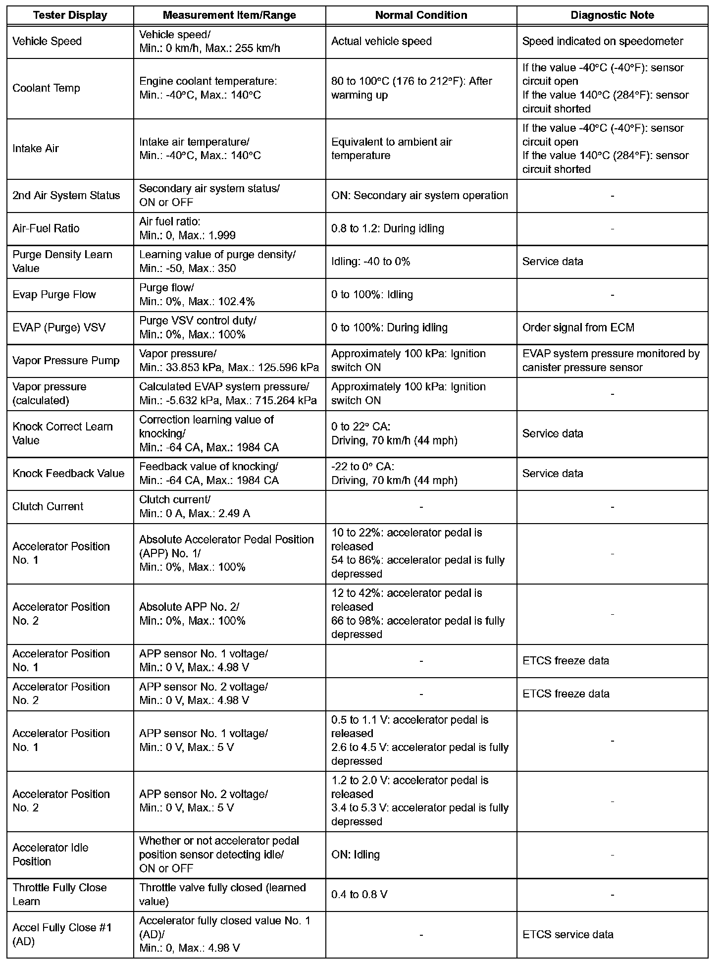 NOTE: In the table, the values listed under "Normal Condition" are reference values. Do not depend solely on these reference values when deciding whether a part is faulty or not.