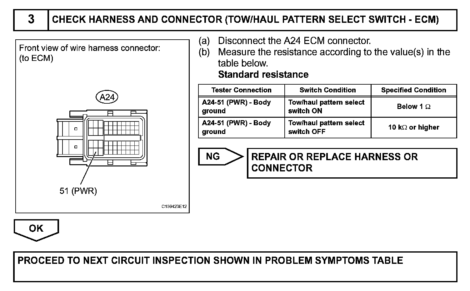 The ECM receives tow/haul pattern select switch information and performs the tow/haul control. While the tow/haul control is operating, in contrast to normal mode, low gears are used to increase engine braking and towing power, reduce frequent shifts, and improve driveability. The tow/haul control includes throttle control, shift schedule control, wide open throttle shift timing control and AI-SHIFT control. Tow/haul mode only operates when the shift lever is in the D position and the tow/haul pattern select switch is ON.