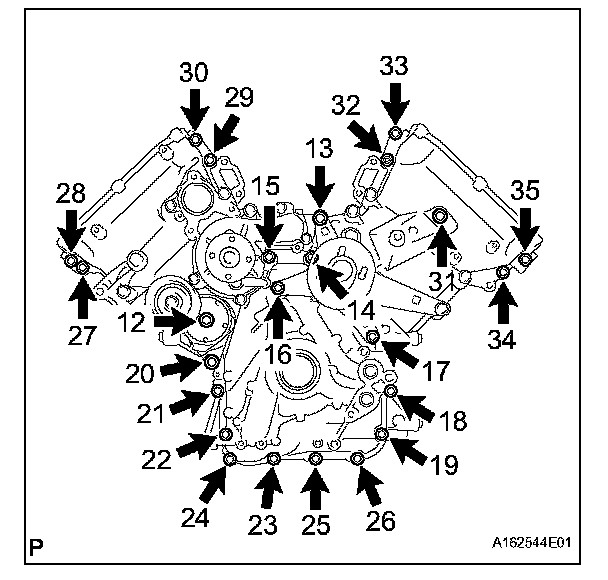 Step 3: Tighten the 23 bolts labeled 12 to 35 and nut in several steps in the sequence shown in the illustration.