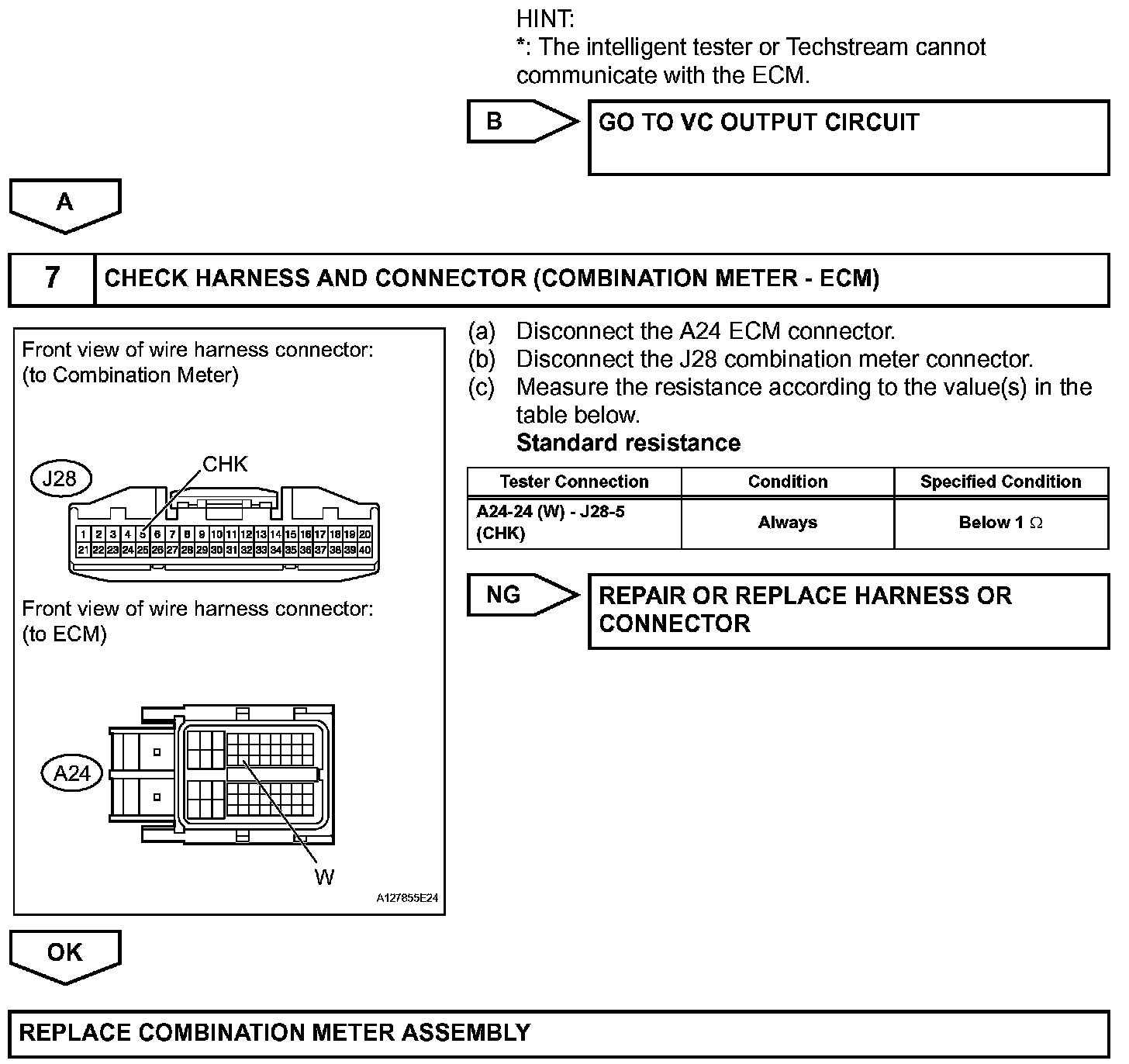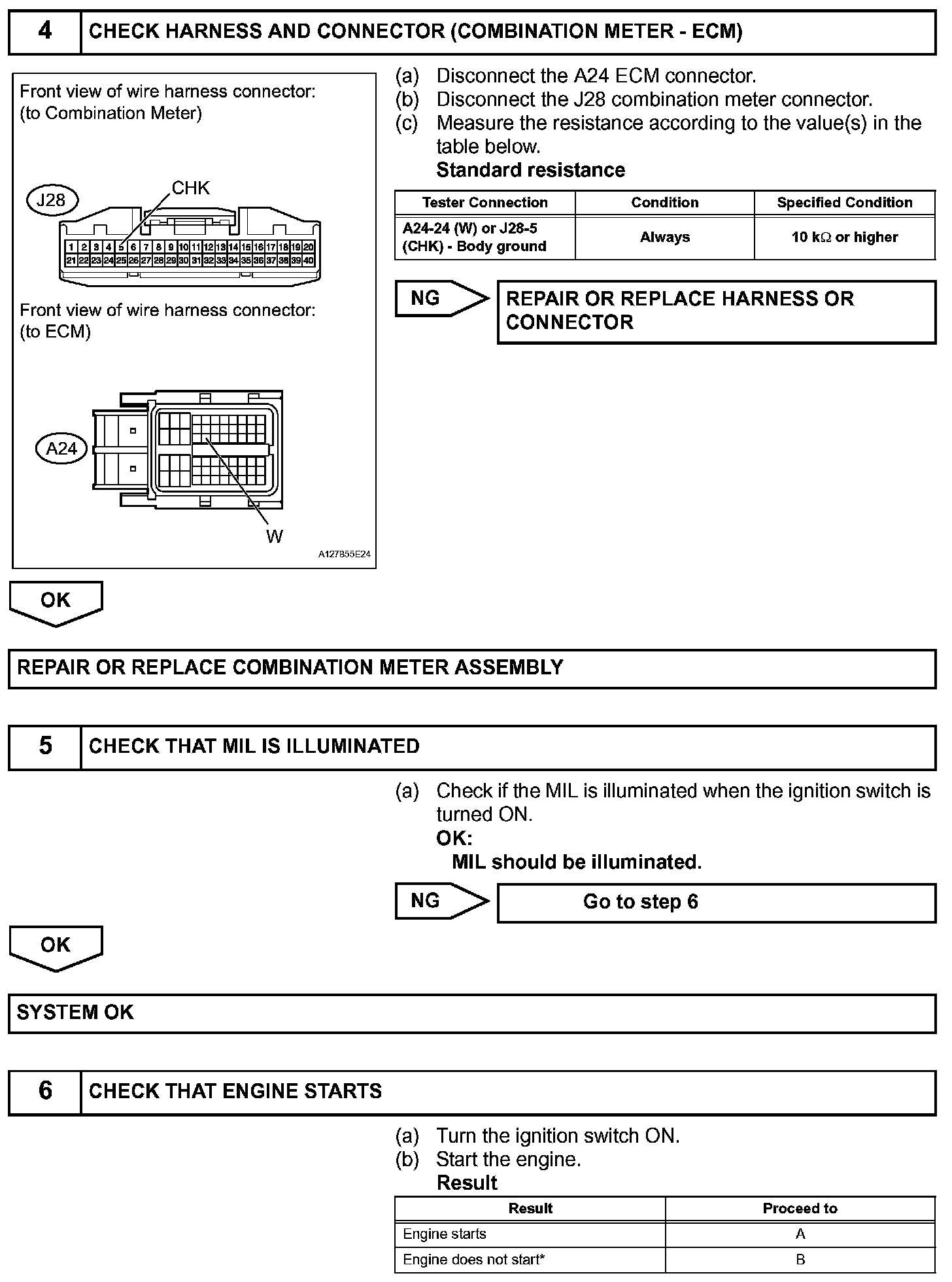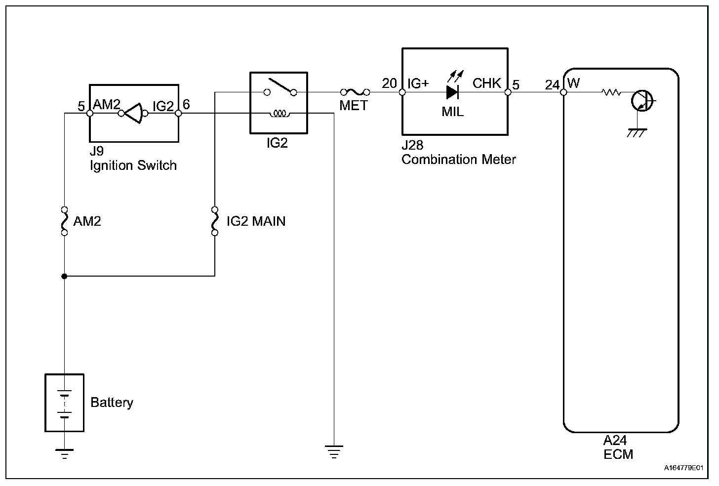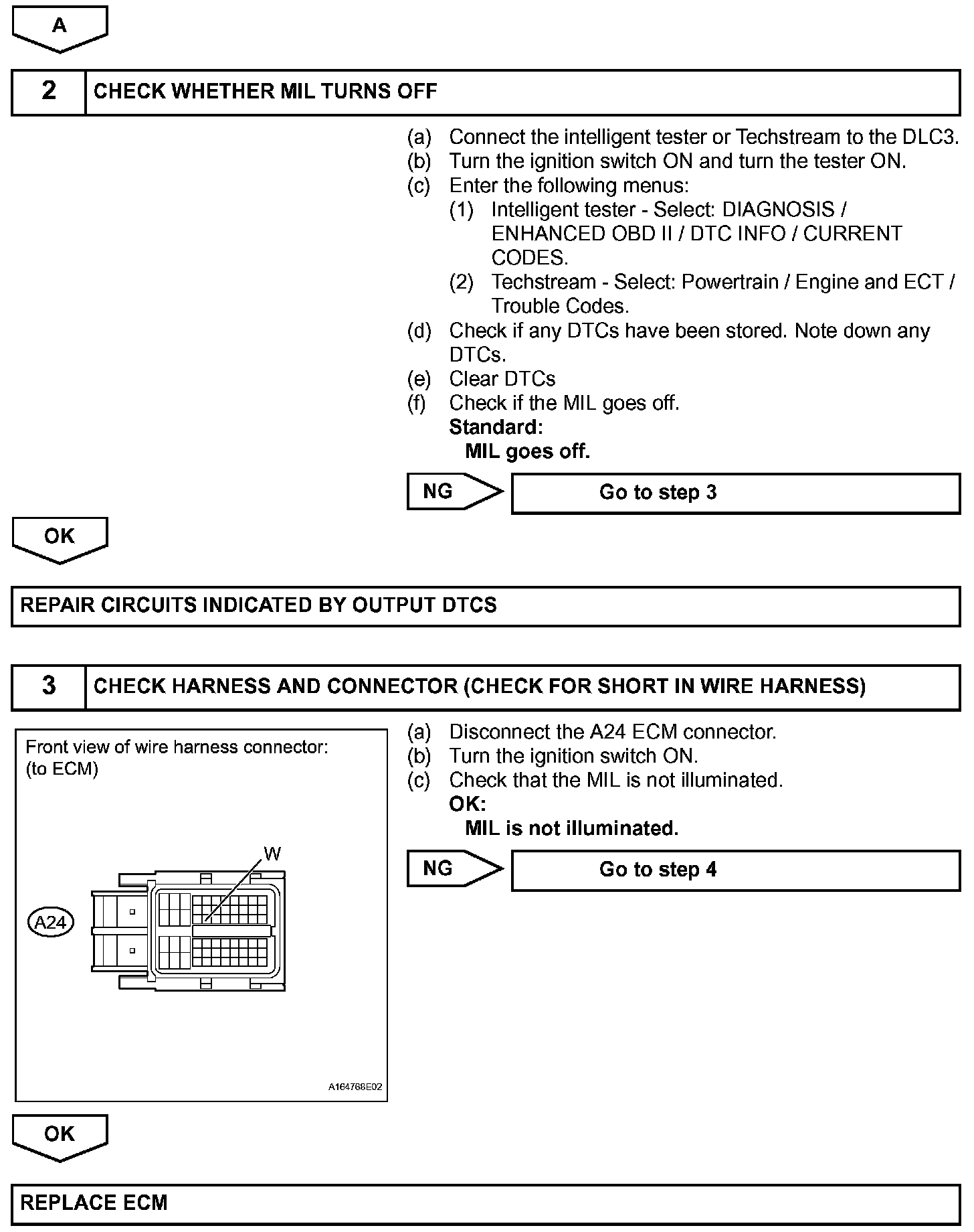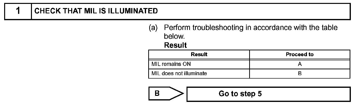 The MIL (Malfunction Indicator Lamp) is used to indicate vehicle malfunction detections by the ECM. When the ignition switch is turned ON, power is supplied to the MIL circuit, and the ECM provides the circuit ground which illuminates the MIL.The MIL operation can be checked visually: When the ignition switch is first turned ON, the MIL should be illuminated and should then turn off when the engine is started. If the MIL remains illuminated or is not illuminated, conduct the following troubleshooting procedure using the intelligent tester or Techstream.
