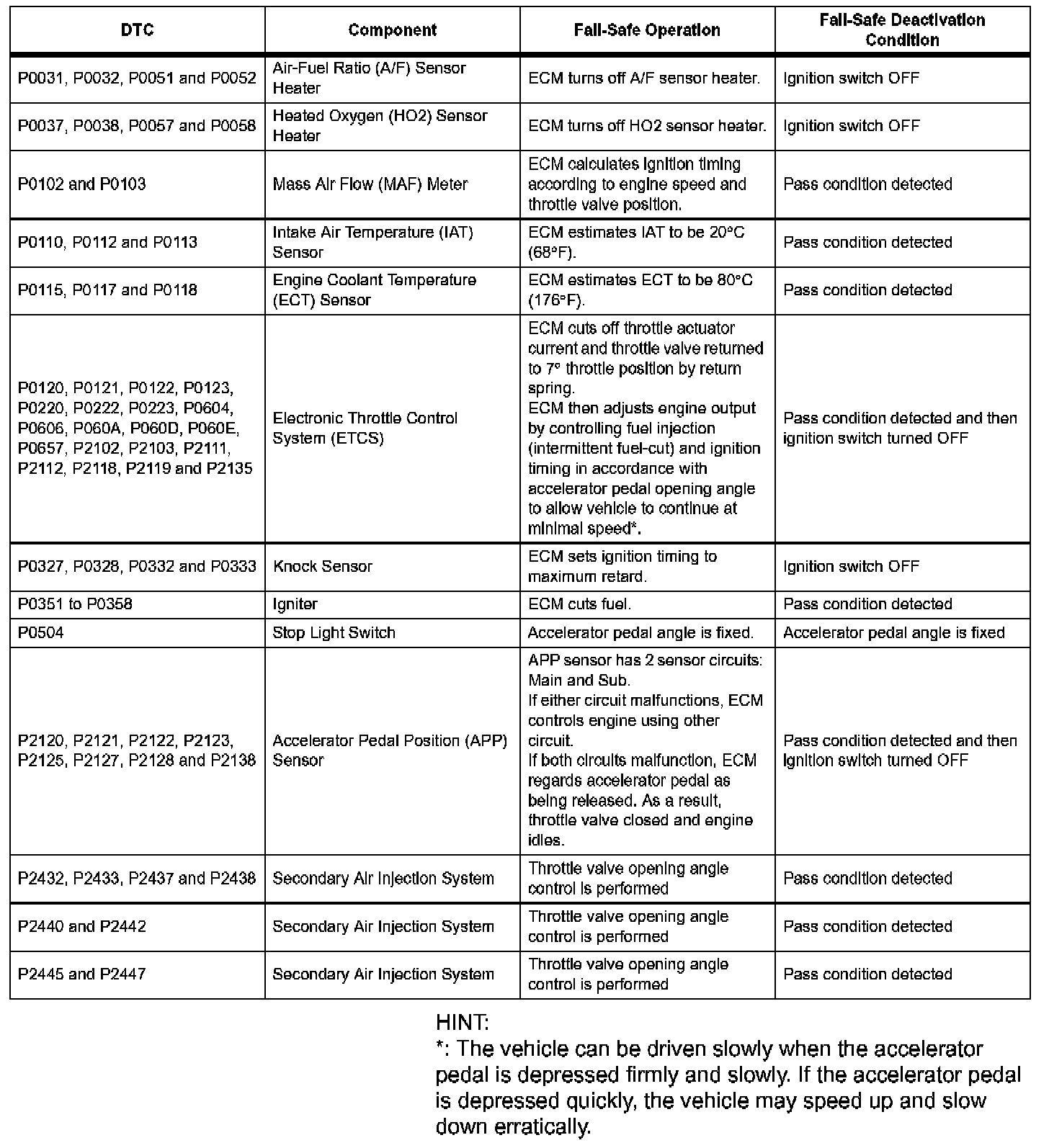 If any of the following DTCs are set, the ECM enters fail-safe mode to allow the vehicle to be driven temporarily.