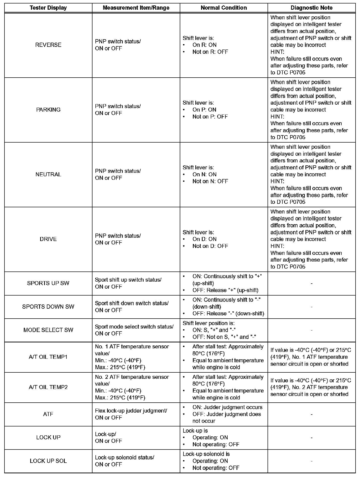 HINT: Using the intelligent tester or Techstream to read the Data List allows the values or states of switches, sensors, actuators and other items to be read without removing any parts. This non-intrusive inspection can be very useful because intermittent conditions or signals may be discovered before parts or wiring is disturbed. Reading the Data List information early in troubleshooting is one way to save diagnostic time.