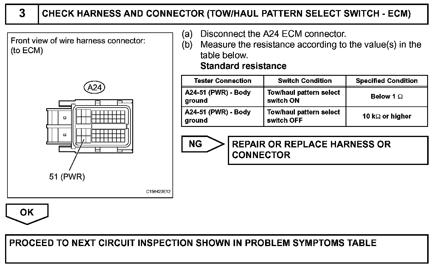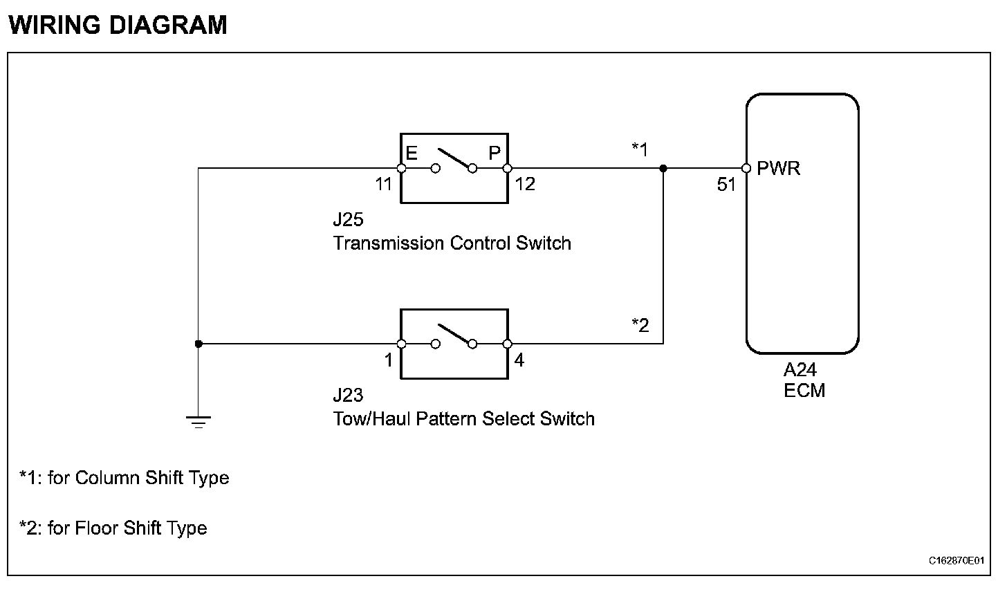 The ECM receives tow/haul pattern select switch information and performs the tow/haul control. While the tow/haul control is operating, in contrast to normal mode, low gears are used to increase engine braking and towing power, reduce frequent shifts, and improve driveability. The tow/haul control includes throttle control, shift schedule control, wide open throttle shift timing control and AI-SHIFT control. Tow/haul mode only operates when the shift lever is in the D position and the tow/haul pattern select switch is ON.