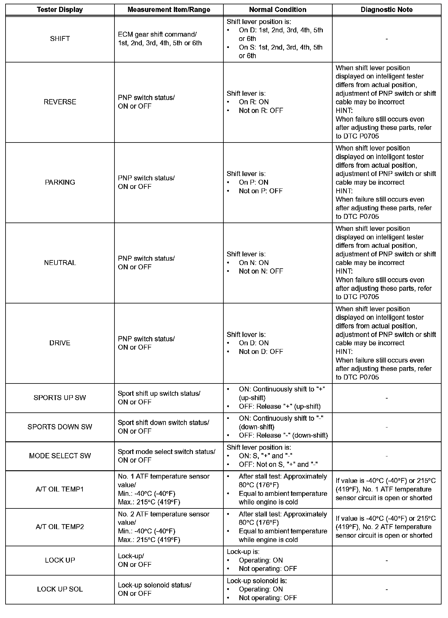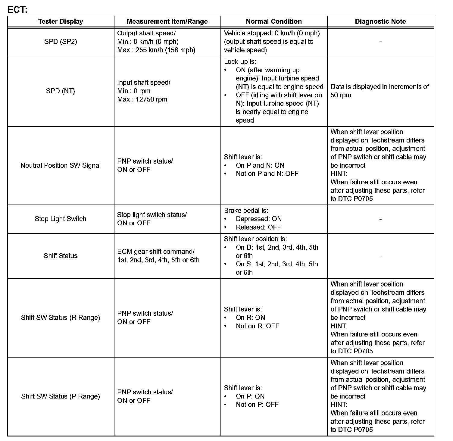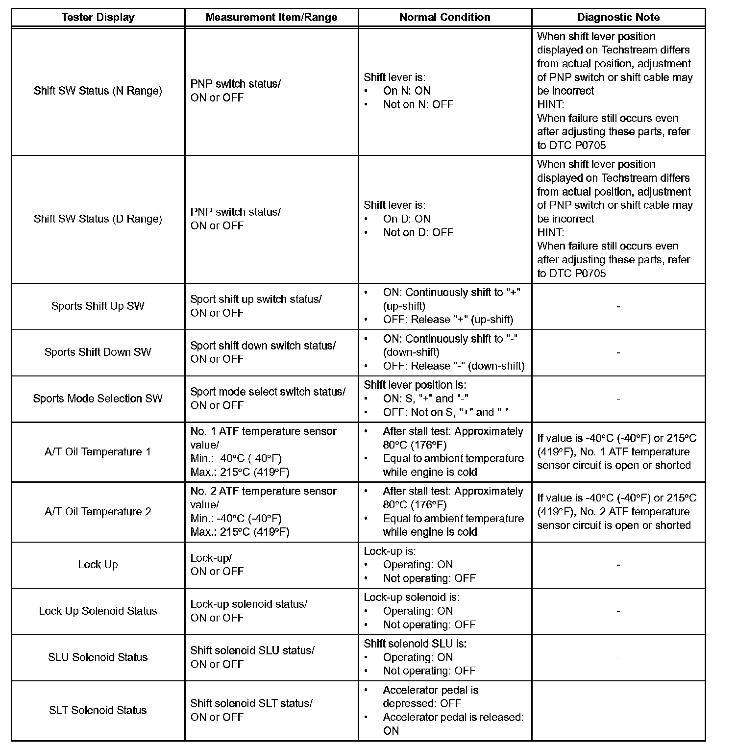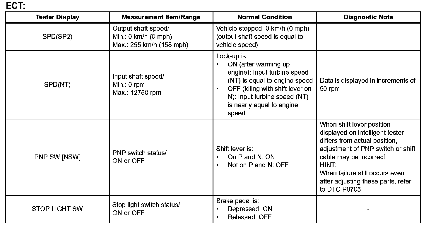 HINT: Using the intelligent tester or Techstream to read the Data List allows the values or states of switches, sensors, actuators and other items to be read without removing any parts. This non-intrusive inspection can be very useful because intermittent conditions or signals may be discovered before parts or wiring is disturbed. Reading the Data List information early in troubleshooting is one way to save diagnostic time.