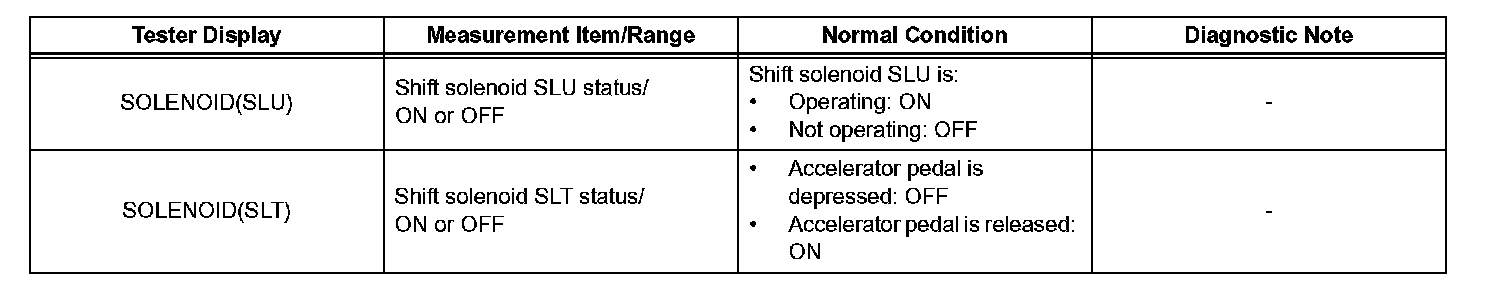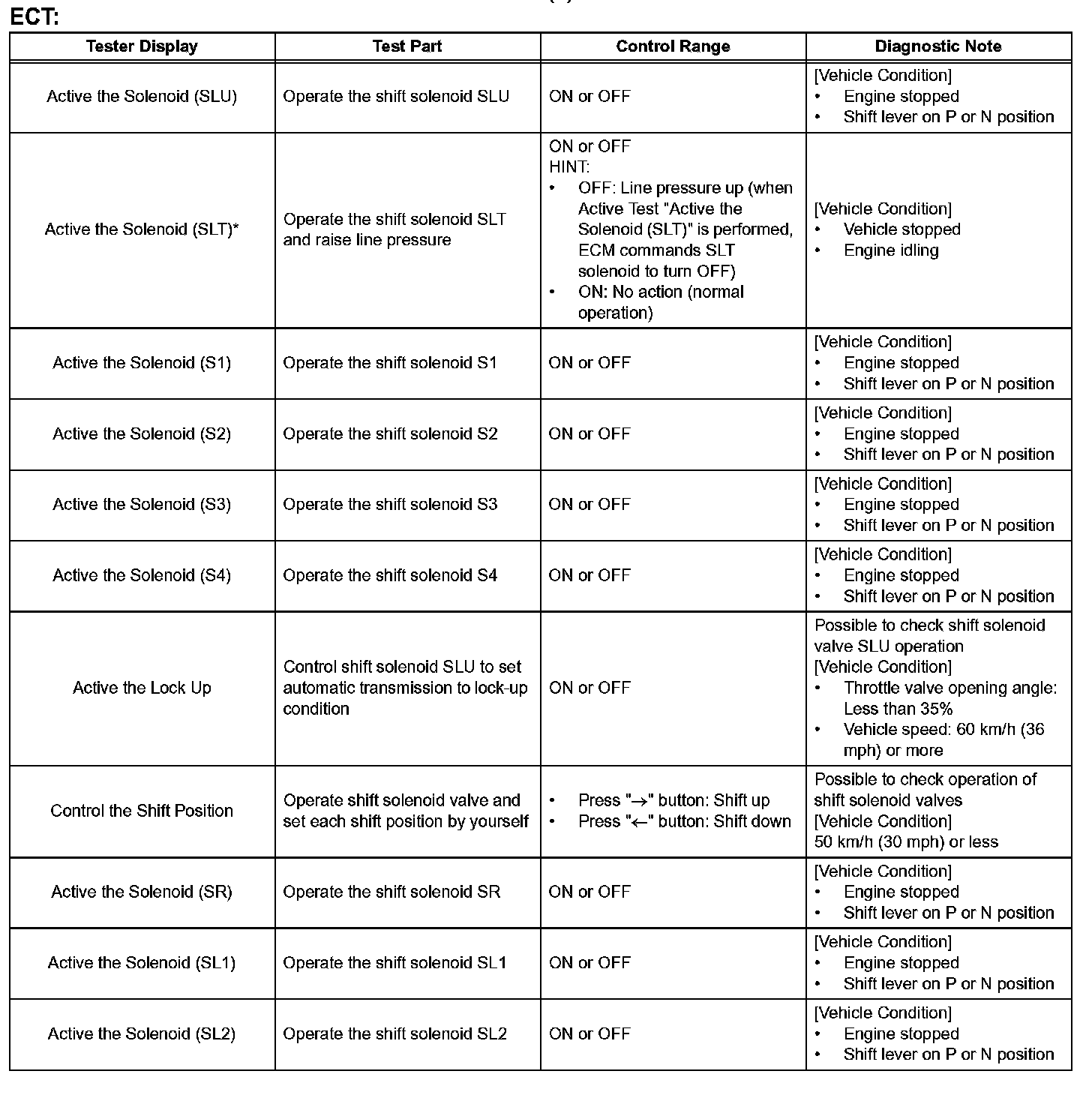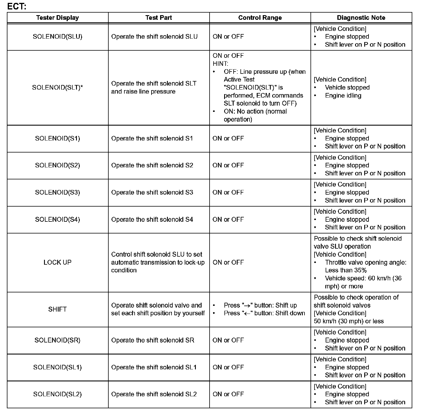 HINT: *: SOLENOID(SLT) in the Active Test is performed to check the line pressure changes by connecting SST to the automatic transmission, which is used in the HYDRAULIC TEST as well. Please note that the pressure values in the Active Test and HYDRAULIC TEST are different.