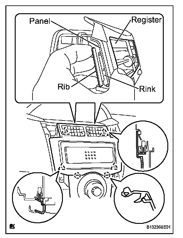 - To avoid breakage of the instrument cluster finish panel center when removing it, do not apply excessive force to the register or pull out the rink or panel portions.