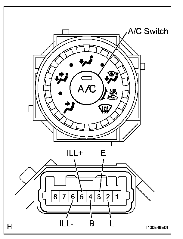 1. Connect the positive (+) lead from the battery to terminal 5 (ILL+) and the negative (-) lead to terminal 6 (ILL-), then check that the bulb illuminates.