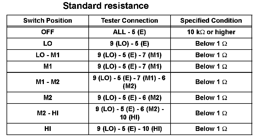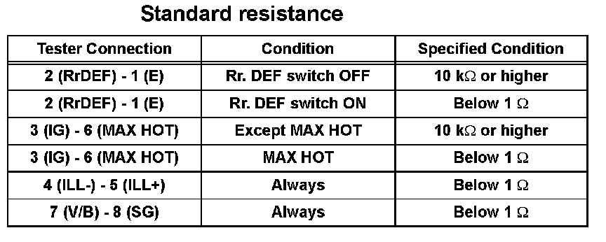 1. Using an ohmmeter, measure the resistance and check the results in accordance with the values in the table given.
