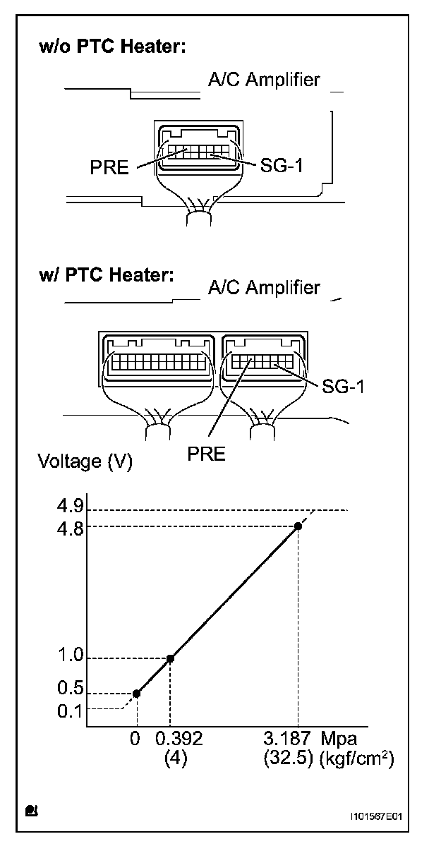 5. Using a voltmeter, measure the voltage between connector terminals 6 (PRE) and 11 (SG-1) of the air conditioner amplifier.
