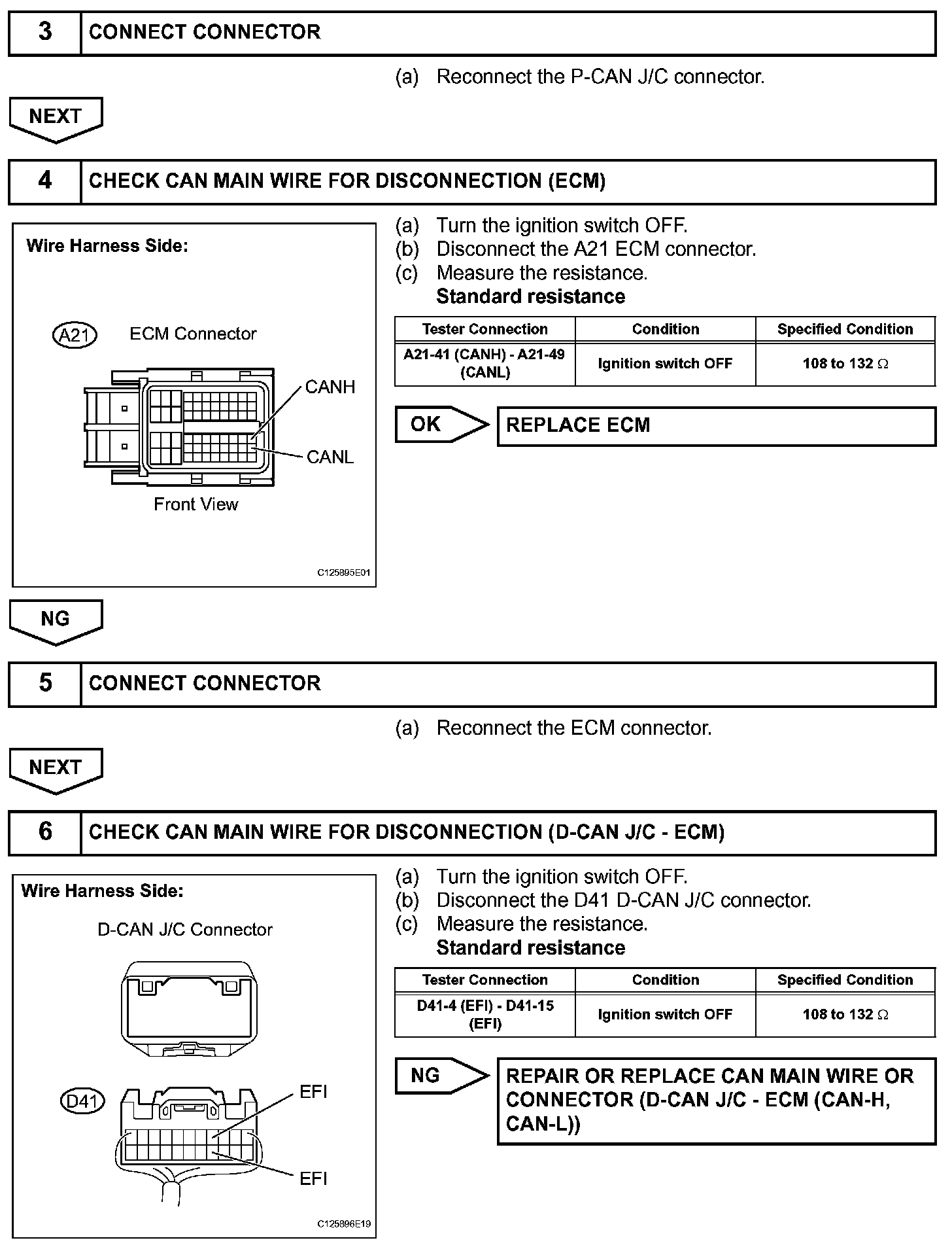 There may be an open circuit in the CAN main wire and/or the DLC3 branch wire when the resistance between terminals 6 (CANH) and 14 (CANL) of the DLC3 is 69 ohms or higher.