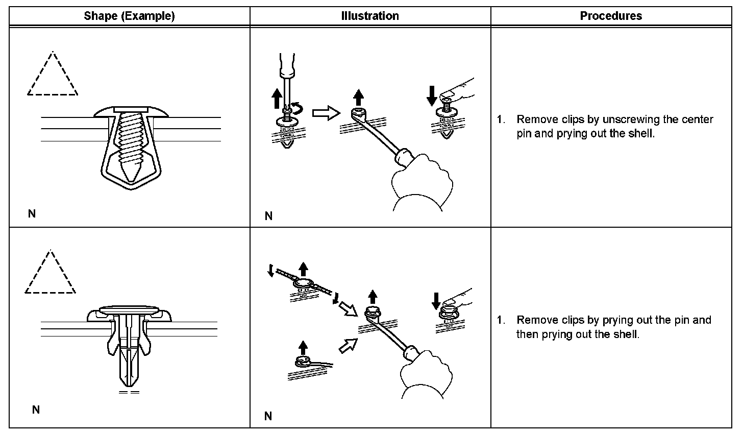 1. The removal and installation methods of typical clips used for vehicle body parts are shown in the table.
