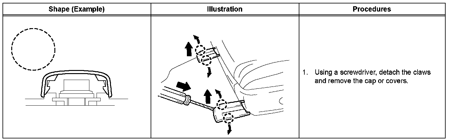 1. The removal and installation methods of typical claws used for vehicle body parts are shown in the table.