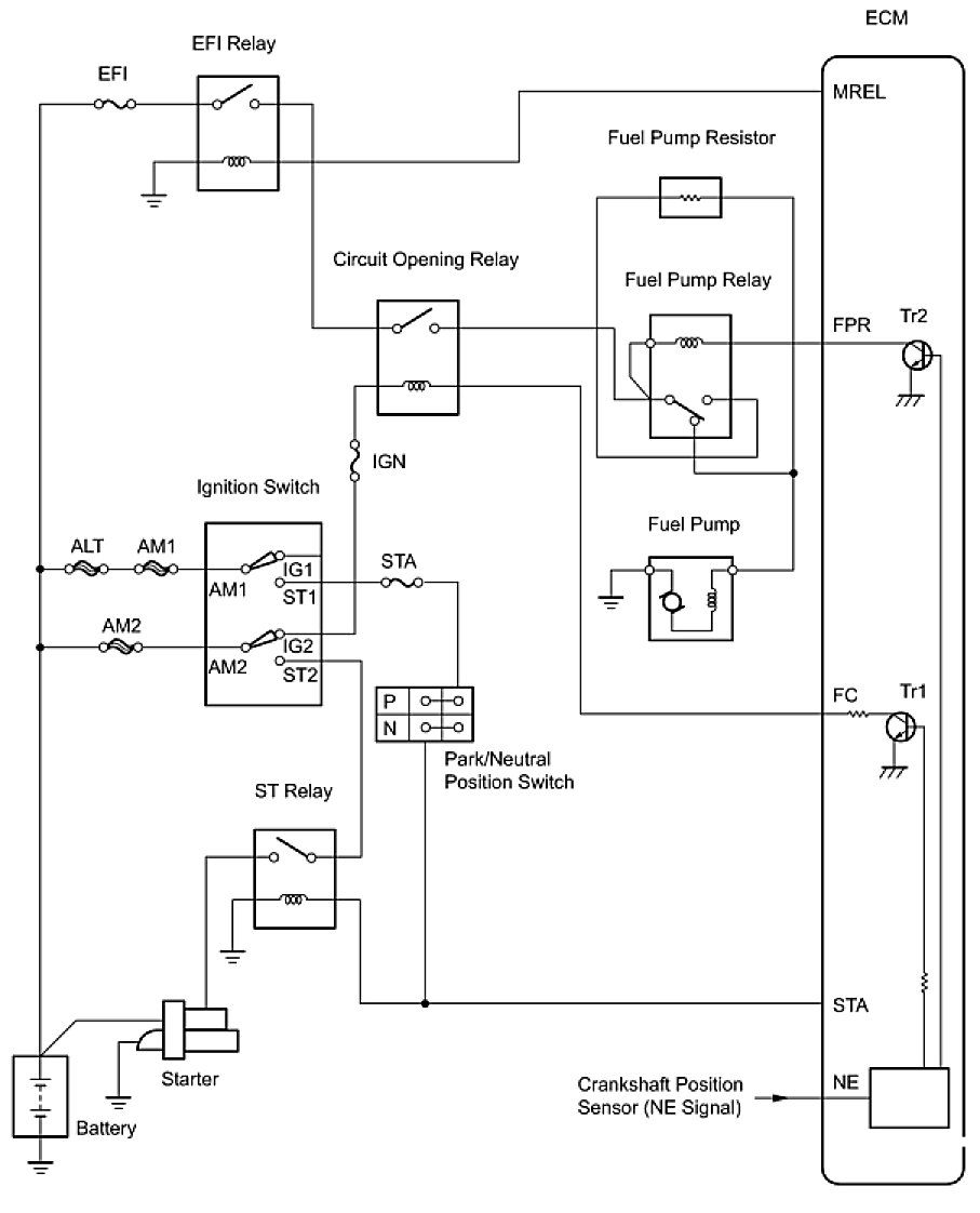 In the diagram below, when the engine is cranked, current flows from terminal ST1 of the ignition switch into the ECM to the ST (starter) relay coil and also current flows to terminal STA of the ECM (STA signal).