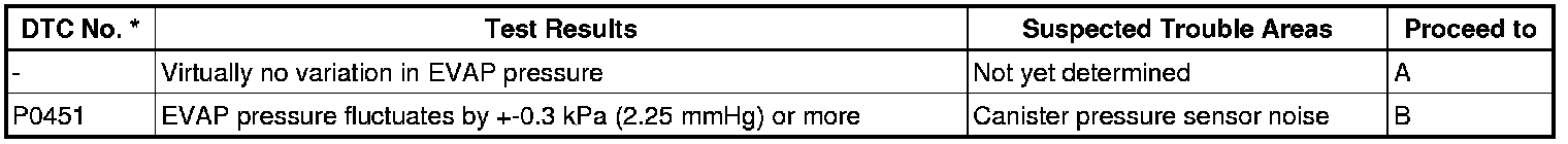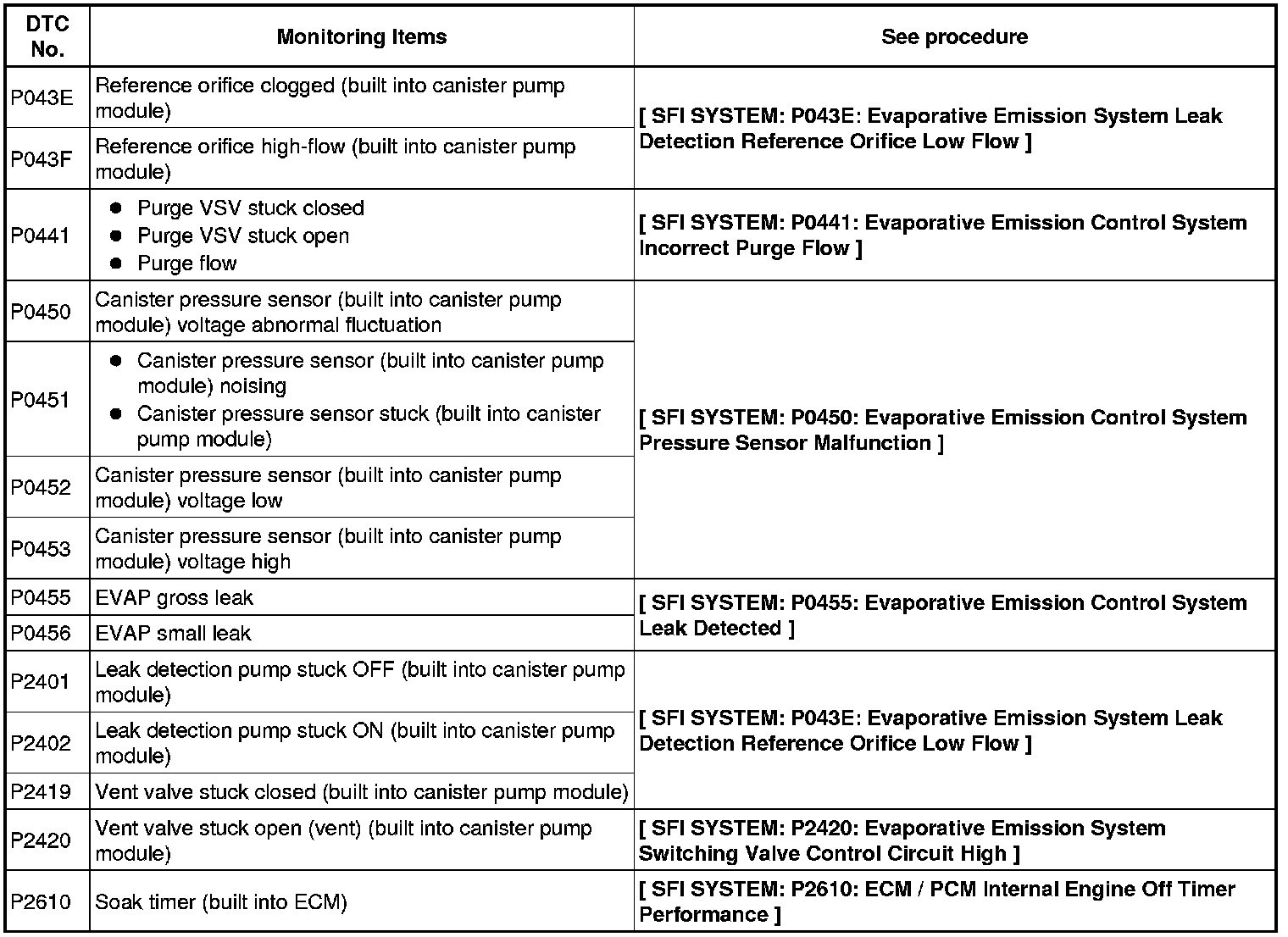 If any EVAP system DTCs are set, the malfunctioning area can be determined using the table below.
