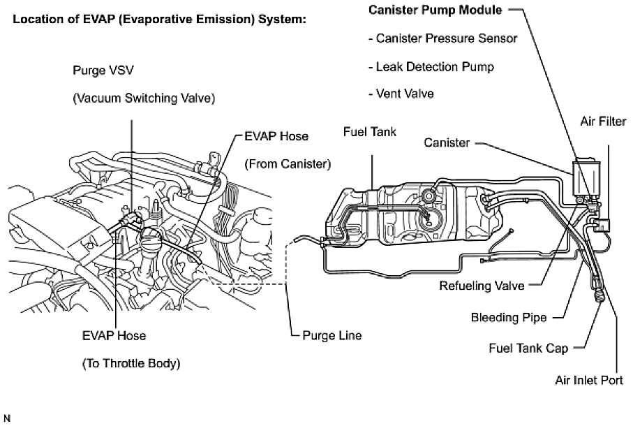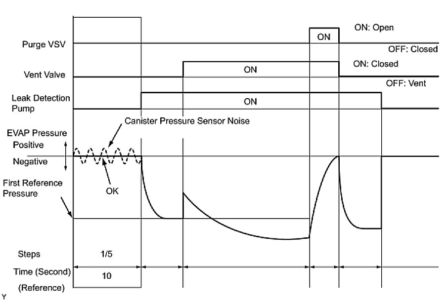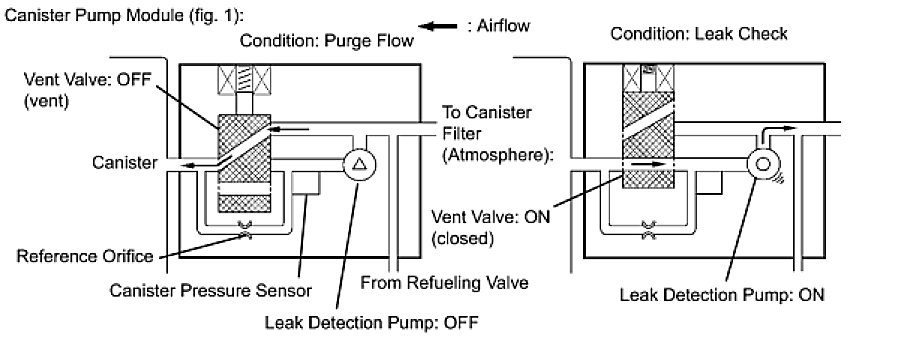 The leak detection pump creates negative pressure (vacuum) in the EVAP system and the pressure is measured. Finally, the ECM monitors for leaks from the EVAP system and malfunctions in both the canister pump module and purge VSV, based on the EVAP pressure.