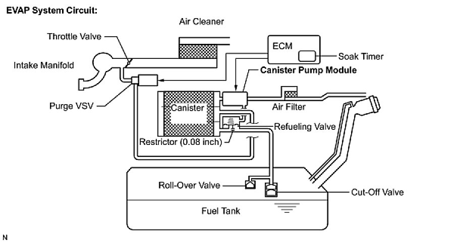While the engine is running, if a predetermined condition (closed-loop etc.) is met, the purge VSV is opened by the ECM and stored fuel vapors in the canister are purged to the intake manifold. The ECM changes the duty cycle ratio of the purge VSV to control purge flow volume.