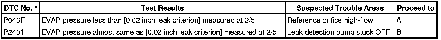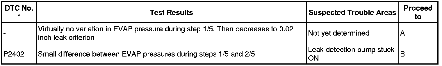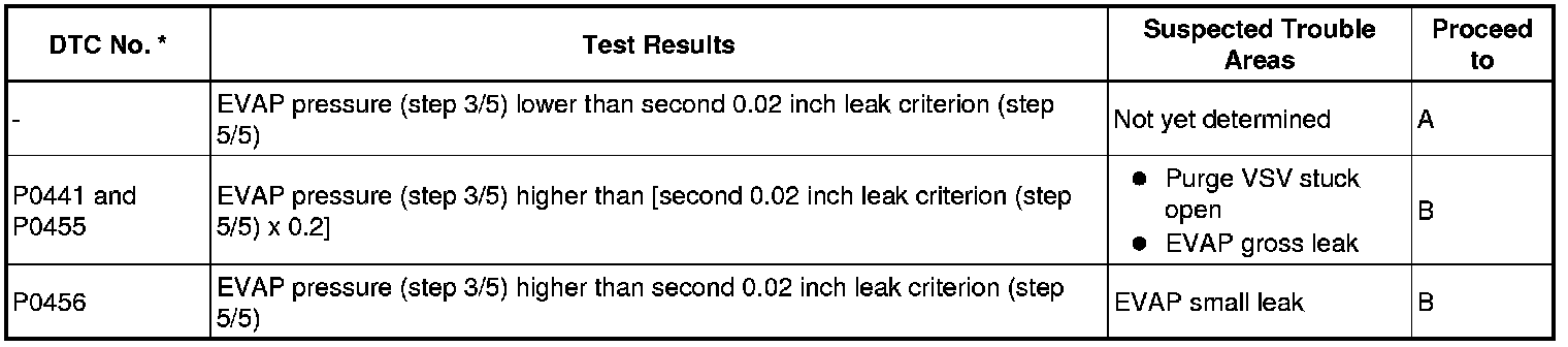 NOTICE: If the 0.02 inch leak criterion difference between the first and second checks is greater than the specification, the DTCs corresponding to the 0.02 inch leak criterion (P043E, P043F, P0441, P0455, P0456, P2401 and P2420) will all be stored.