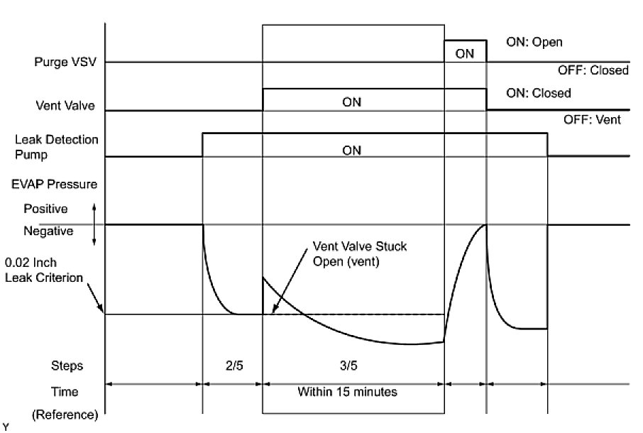 The vent valve turned OFF (open) and the EVAP pressure is then measured. If the variation in the pressure is less than 0.5 kPa (3.75 mmHg), the ECM interprets this as the purge VSV being stuck closed, and illuminates the MIL and sets DTC P0441 (2 trip detection logic).