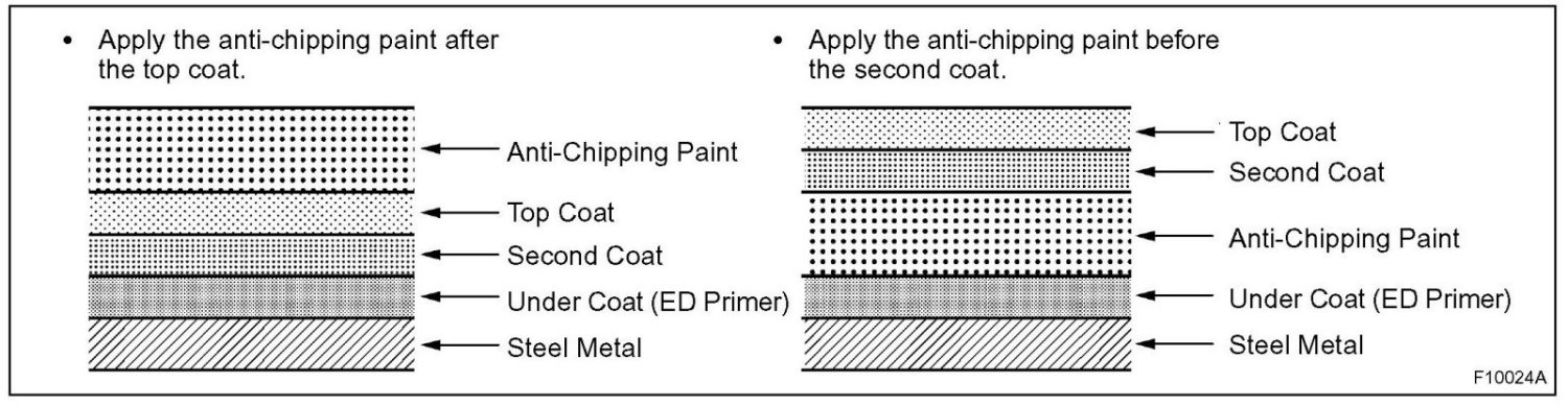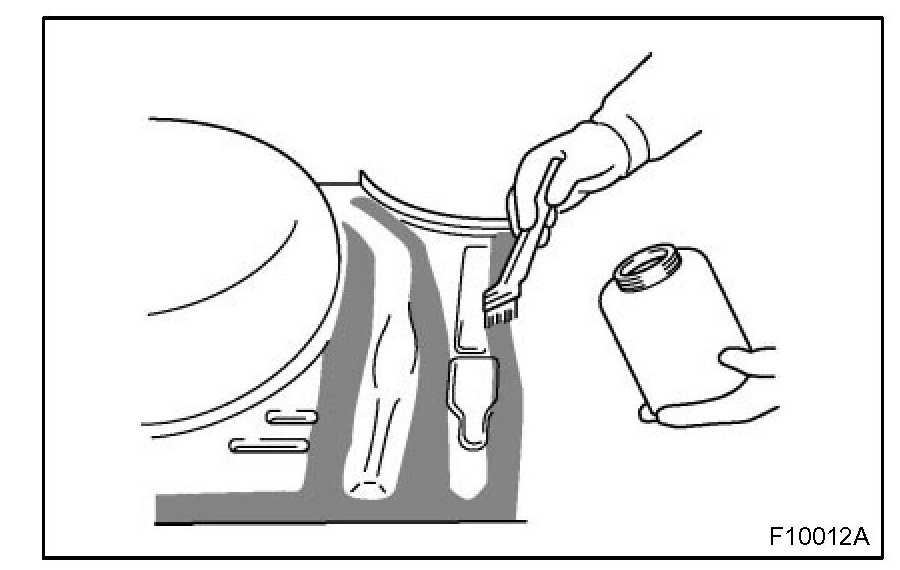 1. To prevent corrosion and protect the body from damage by flying stones, etc., apply anti-chipping paint to the rocker panel, wheel arch areas, balance panel, etc.