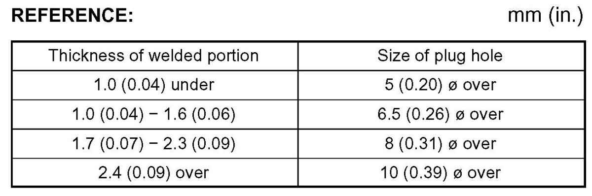 1. When welding panels with a combined thickness of over 3 mm (0.12 in.), use a MIG (Metal Inert Gas) welder for plug welding.
