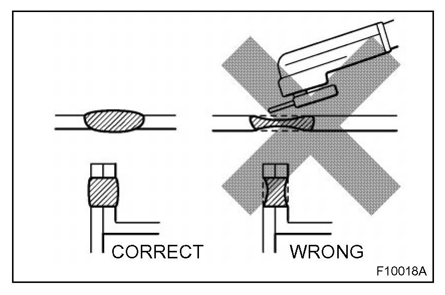 2. Plug welding should be done with a MIG (Metal Inert Gas) welder. Do not gas weld or braze panels at areas other than specified.