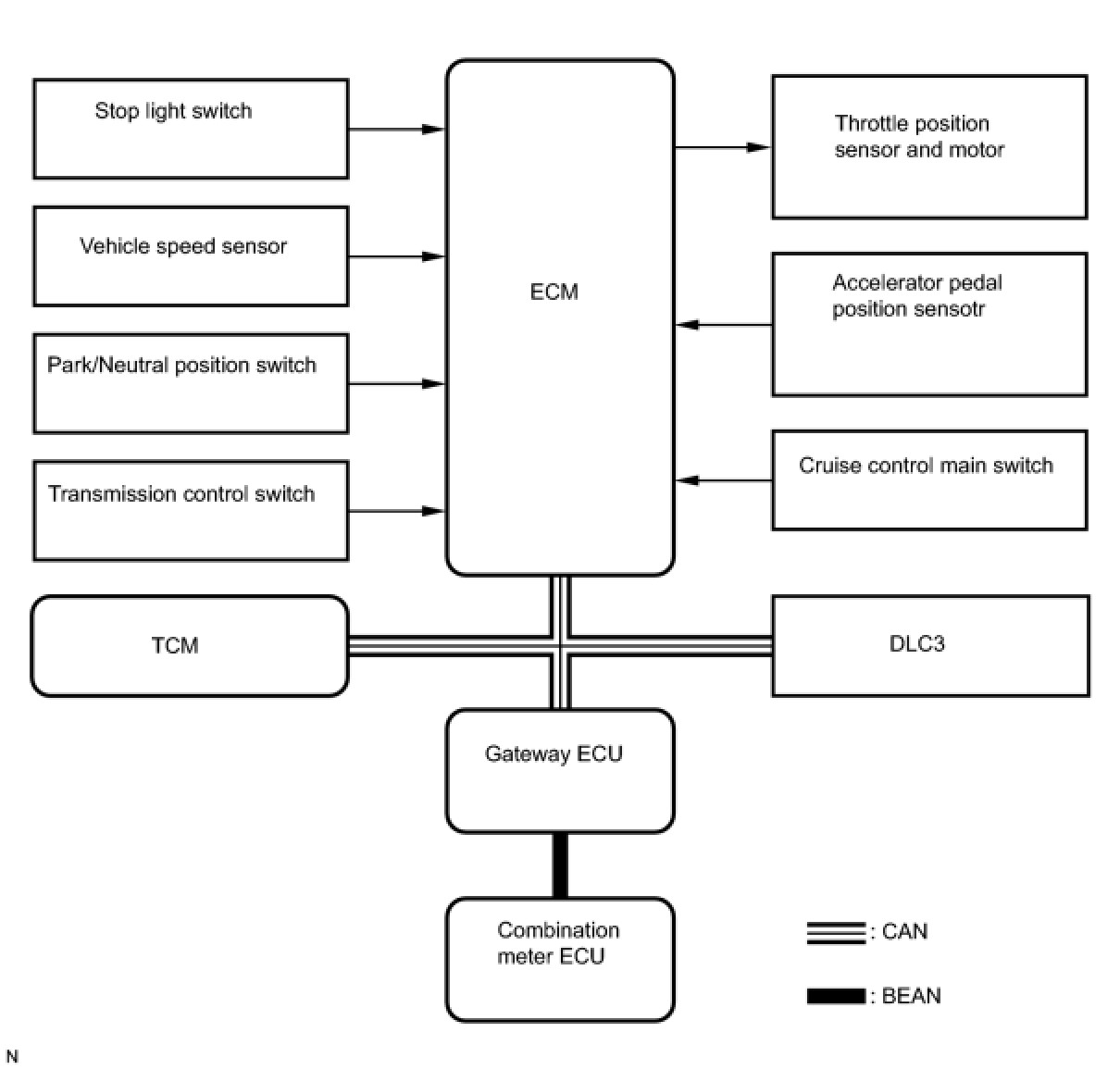 - The ECM receives signals such as ON-OFF, -/SET, +/RES, and CANCEL from the cruise control main switch assembly and executes them.