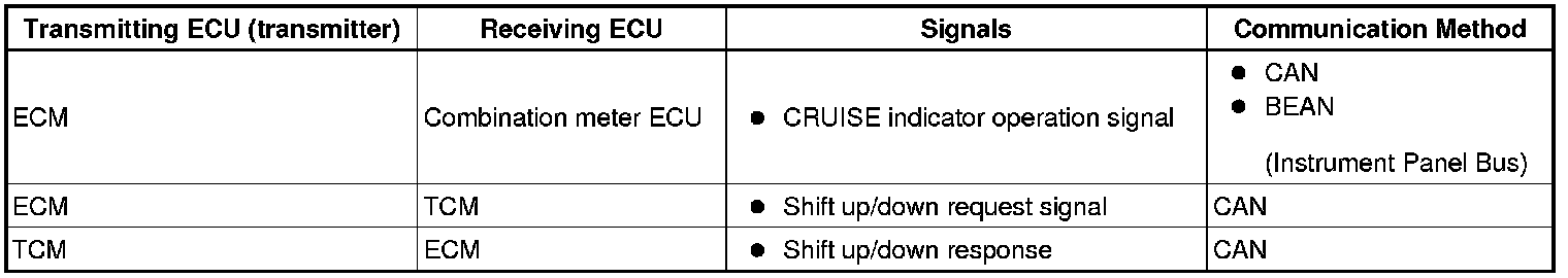 This system is controlled by the ECM, and is activated by the throttle position sensor and motor. The ECM controls the following functions: ON-OFF, -/SET, +/RES, CANCEL, vehicle speed operation, motor output control, and overdrive control.