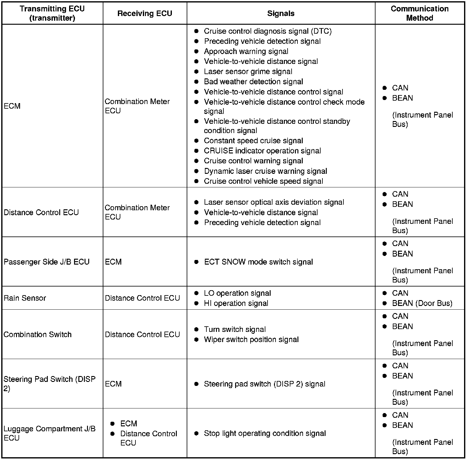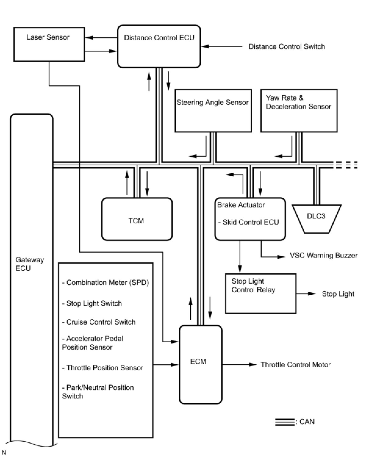 The distance control ECU determines the distance between a vehicle in front and your own, relative speed, target decreasing speed and deceleration rate to transmit a brake demand signal to the skid control ECU via the ECM.