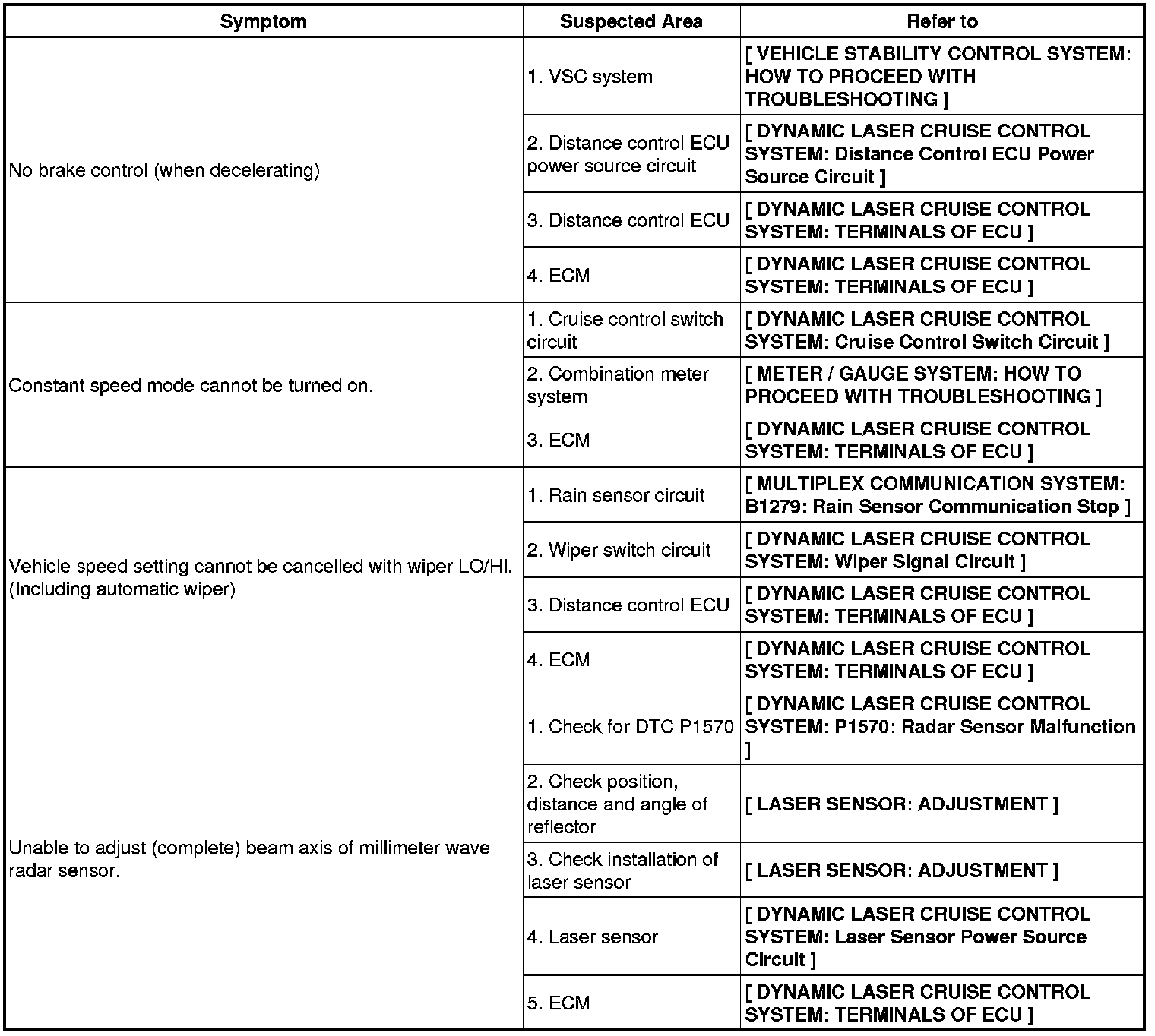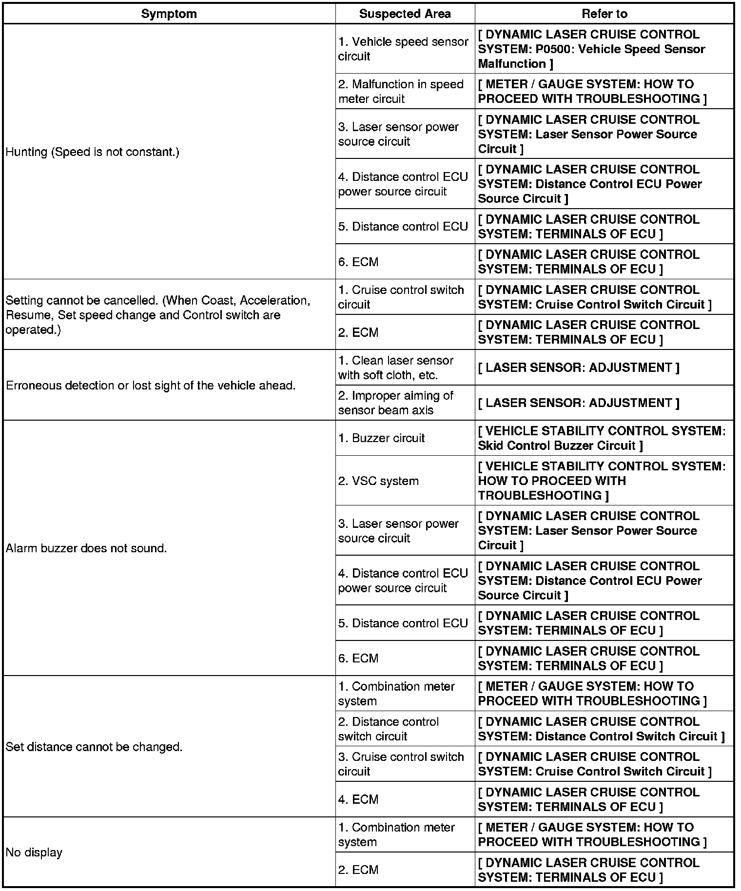 CRUISE CONTROL: DYNAMIC LASER CRUISE CONTROL SYSTEM: PROBLEM SYMPTOMS TABLE
