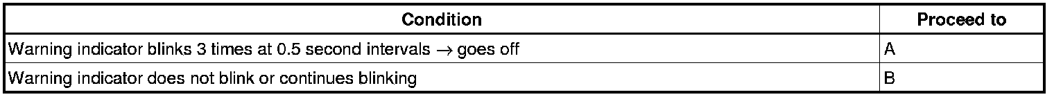 - If the warning indicator does not come on or comes on for more than 3 seconds, inspect and repair according to "PROBLEM SYMPTOMS TABLE"