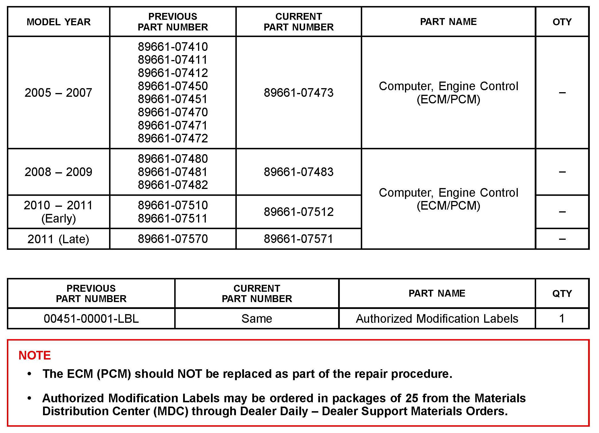 ^ ECM part number [Refer to the Parts Information section for the CURRENT PART NUMBER]