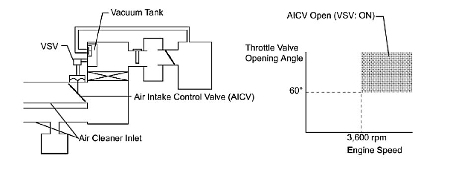 When the engine is operating in the low-to-mid speed range, this control operates the AICV to close one of the air cleaner inlets. When the engine speed is more than 3,600 rpm and the opening angle of the throttle valve is more than 60°, the ECM activates the VSV and opens the AICV.
